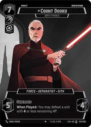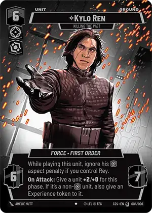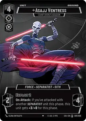 Die Karten selbst sind sechs Einheiten, die prominente Vertreter der dunklen Seite der Macht darstellen. Aus Der Funke einer Rebellion haben wir die Einheiten Count Dooku (2024 Convention Exclusive, 1), Darth Vader (2024 Convention Exclusive, 2) und Imperator Palpatine (2024 Convention Exclusive, 3). Aus Schatten der Galaxis haben wir die Einheit Kylo Ren (2024 Convention Exclusive, 4). Und… was ist das? Es sind auch ein paar Einheiten aus dem dritten Set mit dabei! Richtig, aus Niedergang der Republik haben wir die Einheiten Asajj Ventress (2024 Convention Exclusive, 5) und Darth Maul (2024 Convention Exclusive, 6), hier in ihrer ganzen Pracht. Auch wenn du diese beiden Karten bis zum offiziellen Erscheinen von Niedergang der Republik nicht bei Organized Play-Events spielen kannst, kannst du dich schon ein paar Monate früher darauf freuen, sie deiner Sammlung hinzuzufügen!
