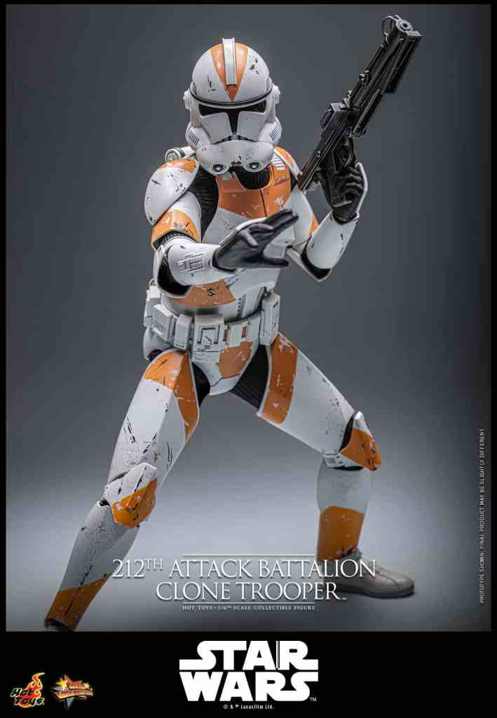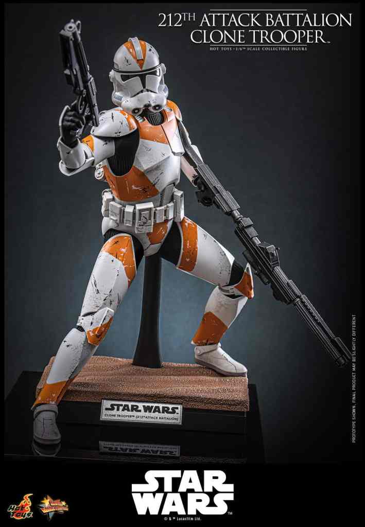 Hot Toys is excited to present the 1/6th scale 212th Attack Battalion Clone Trooper™ Collectible Figure, meticulously crafted to honor the valor and legacy of this iconic unit. The figure features a finely crafted helmeted head with battle weathering. Dressed in a finely crafted set of white armor painted with bold orange patterning and weathering effects, the trooper’s uniform replicates the worn armor as seen in the film. His utility belt is accented with orange detailing, and his boots also show authentic wear from countless engagements.