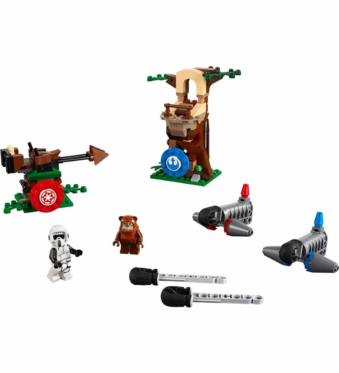 - Das Schlacht-von-Endor-Konstruktionsspielzeug umfasst ein LEGO® Star Wars™ Speeder Bike auf einer Basisplatte und einen baubaren Baum, die beide mit einer Zielscheibe versehen sind.