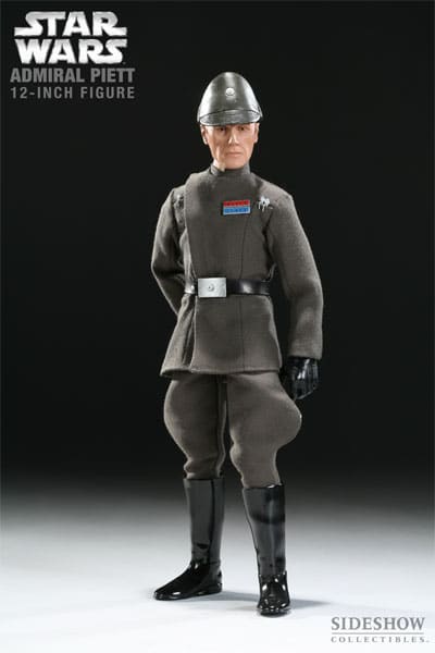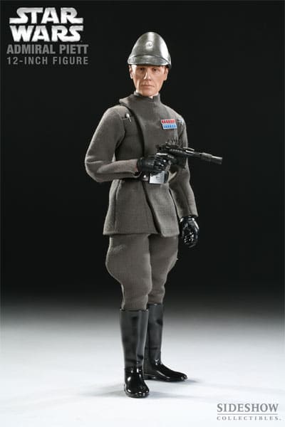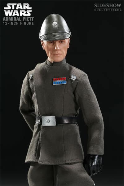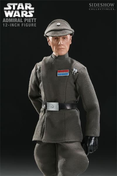 Authentic likeness of Admiral Piett, Fully articulated Prometheus male body with 30+ points of articulation, Interchangeable plastic and cloth officer caps, Tunic with officer rank badge, Pants, Boots, Detailed belt with holster, Officer blaster pistol, Stormtrooper blaster, Interchangeable hands, 12-inch Figure Display Base with ‚Star Wars‘ logo.