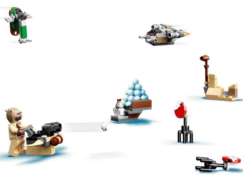 - Weitere Mini-Modelle: eine schwere E-Netz-Blasterkanone (Schneeballwerfer), Übungsziele, die Schneeballiste des Tusken-Räubers sowie Waffenständer des Tusken-Räubers, des Imperiums und des Mandalorianers.