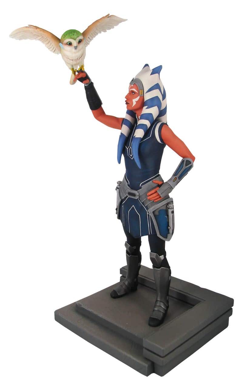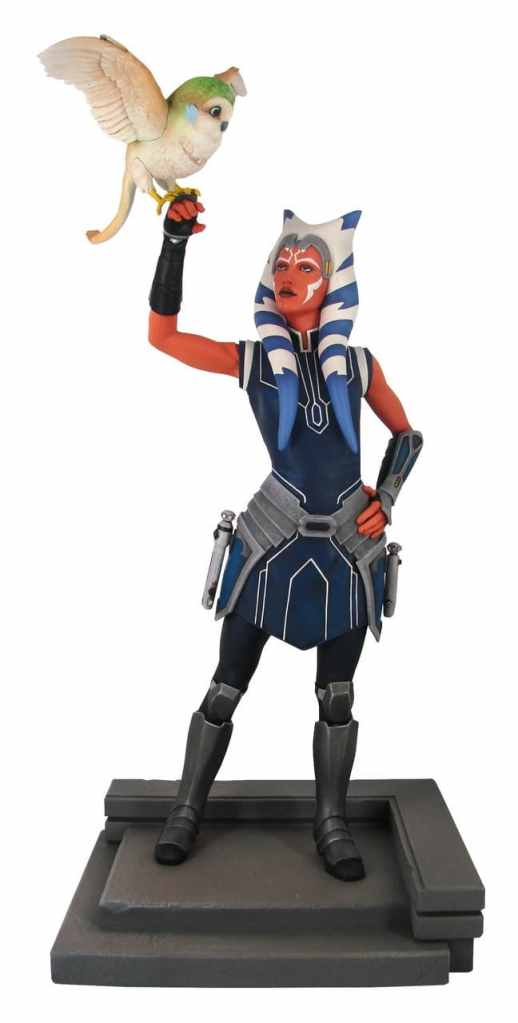 Die Neuankündigung basiert auf der Animationsserie Star Wars: Rebels und ist ca. 28 cm groß. Ahsoka steht auf einer kleinen Treppe und hält den Convor Morai auf der rechten Hand.