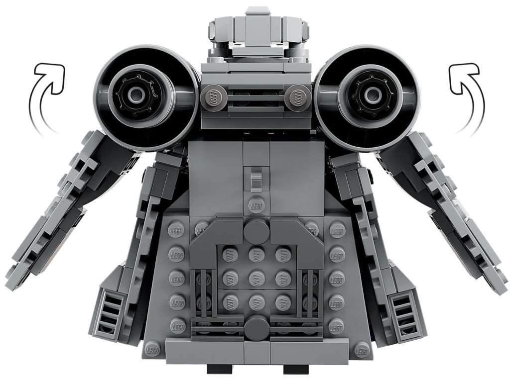- Mobiler Tac-Pod: Dach und Seiten lassen sich öffnen, um Zugang zum Innenraum zu erhalten, in dem 5 LEGO® Minifiguren Platz finden. Der Tac-Pod hat außerdem einen Pilotensitz, verstellbare Flügel, einen drehbaren Doppelshooter und eine Heckrampe