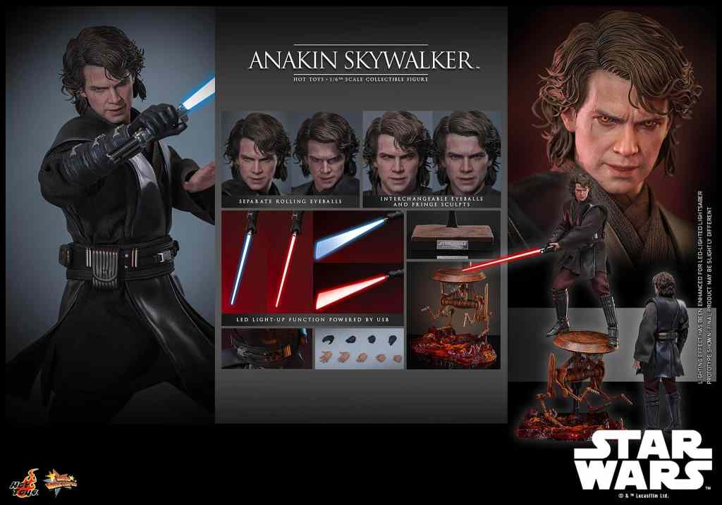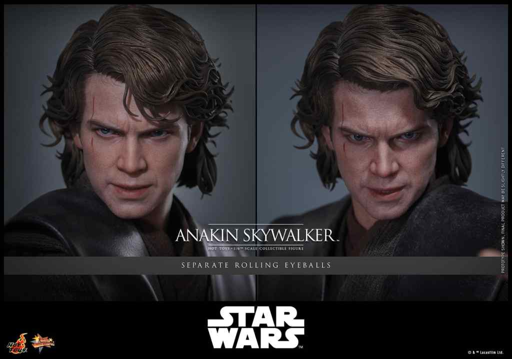 Anakin’s evolving battle-worn expression. For the first time, collectors can switch between lifelike blue iris eyeballs and Sith yellow iris eyeballs to highlight his dramatic shift toward the dark side.