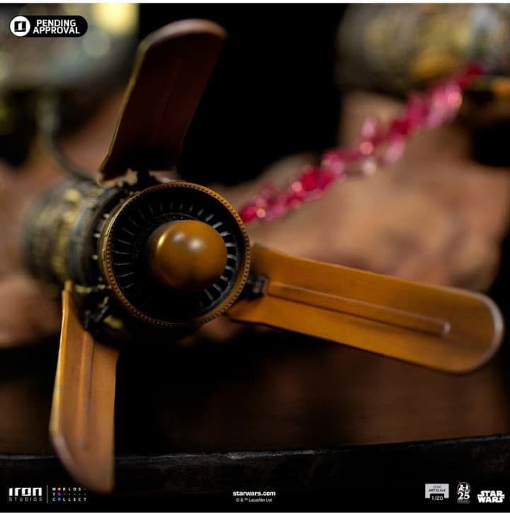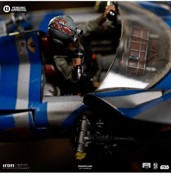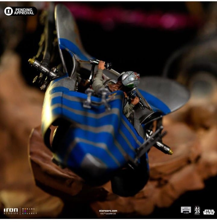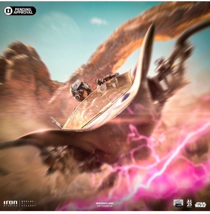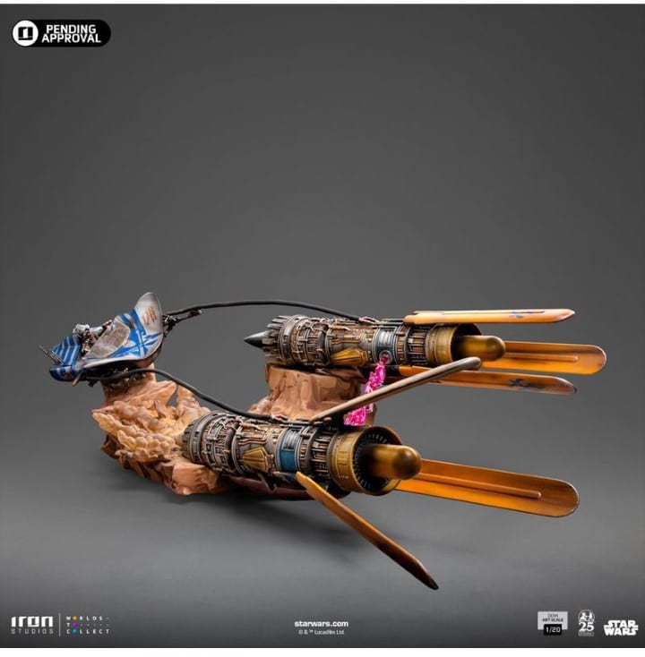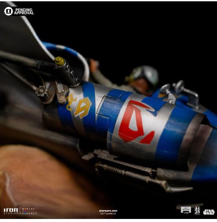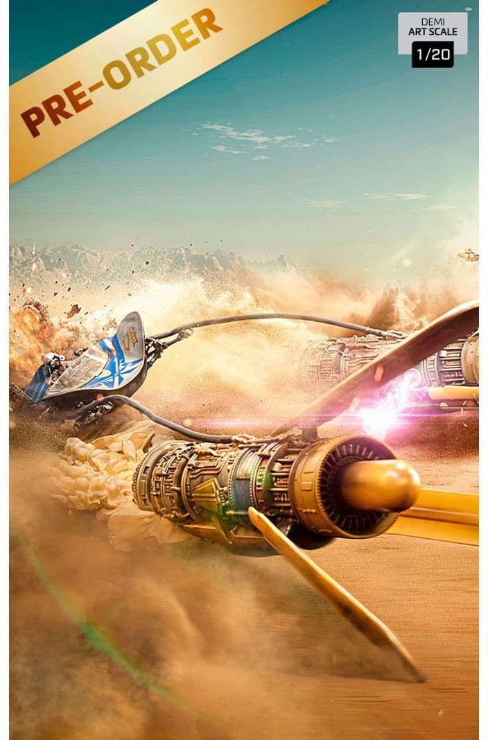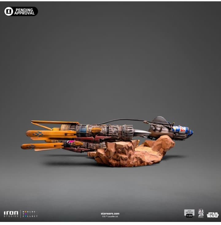 Wie für Iron Studios üblich, wird die Neuankündigung sehr dynamisch inmitten des Boonta Eve-Rennens gezeigt. Die riesigen Turbinen wirbeln den Wüstenstaub auf und der Pod scheint tatsächlich in der Luft zu schweben.