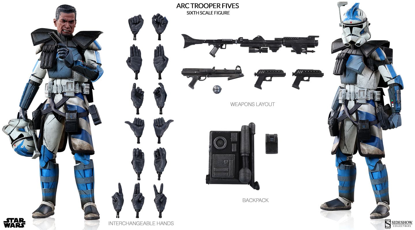 Preferring the nickname ‘Fives,’ CT-27-5555 trained with Domino Squad on Kamino, only barely making it past initiation. Transferred alongside his fellow squadmate, Echo, to the 501st Legion under the command of Captain Rex, the two were later promoted to prestigious ARC trooper status after bravely defending Kamino from Separatist invaders. Featuring a newly designed portrait with a true-grit expression and distinguishing ‘5’ tattoo, the heroic Republic soldier is fully equipped with customized ARC trooper armor bearing markings to honor fallen comrades, a complete arsenal of weapons, and full range of articulation to create action-packed displays.
