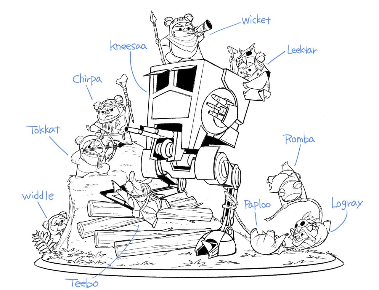Auf der dazugehörigen Konzeptzeichnung wurde freundlicherweise sogar daneben geschrieben, um welche Ewoks es sich in der Szene genau handelt.