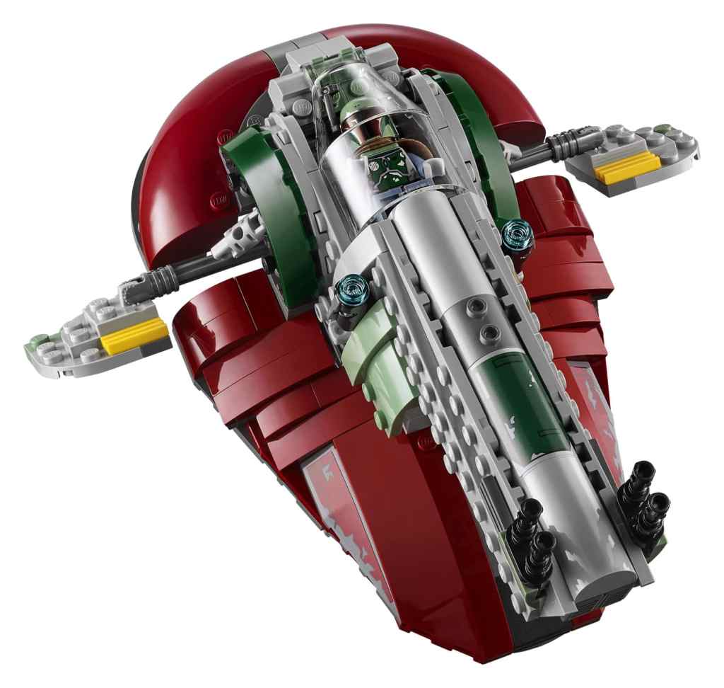 • Modul 1 besteht aus einer Landeplattform mit Schiebetür sowie Boba Fetts Raumschiff Slave I mit aufklappbarem Minifiguren Cockpit und Schwenkflügeln.