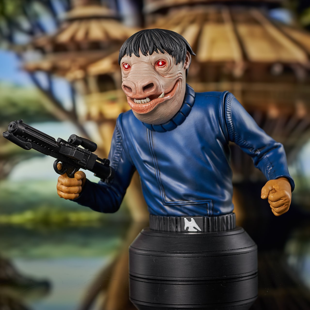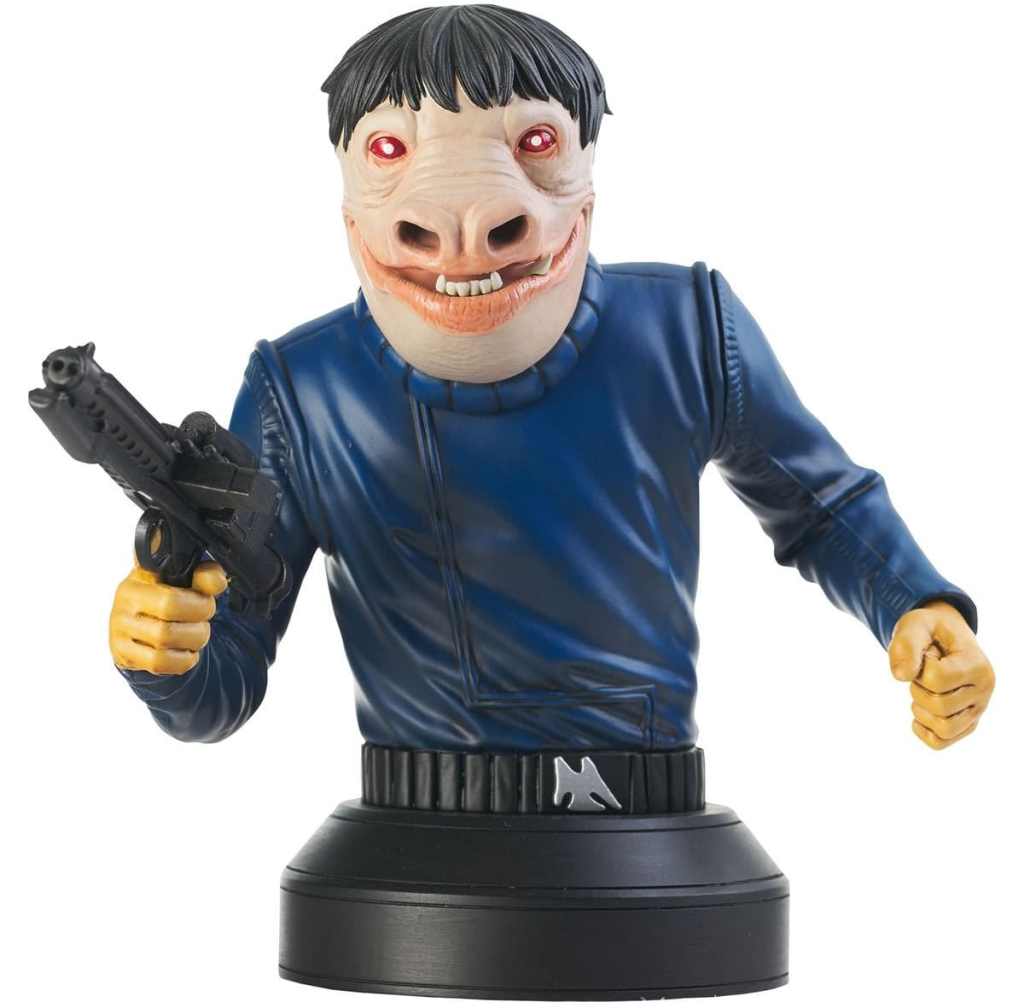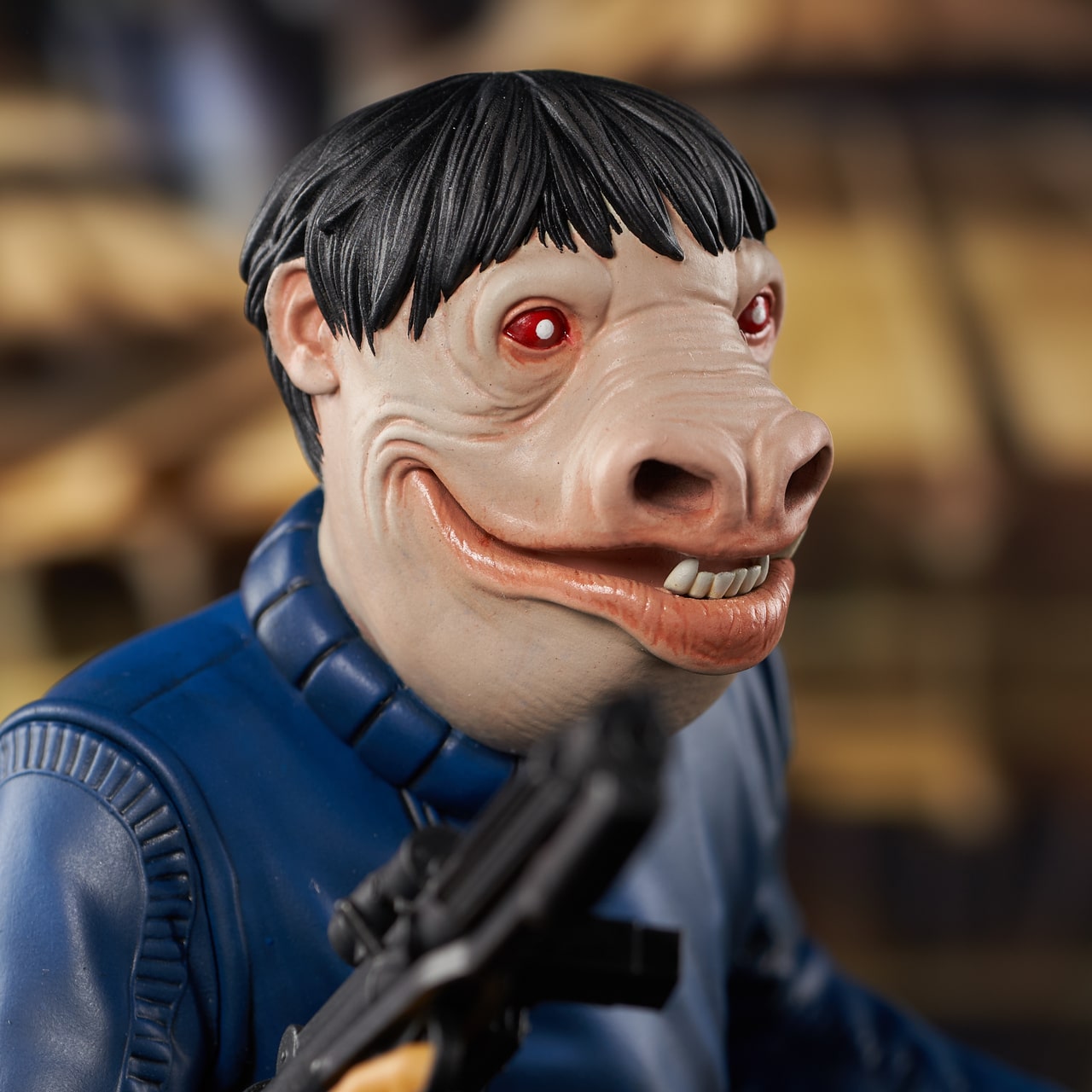 Only available in the Sears Cantina Adventure Set, Blue Snaggletooth was somewhat of a rarity for vintage action figure collectors. Now he’s the newest 1/6 scale bust in the Star Wars line! His real name a mystery, this approximately 5″ bust shows the Snivvian with his blaster drawn and is limited to only 2000 pieces. It comes packaged in a full-color box with a numbered certificate of authenticity. Designed by Leo Silv and sculpted by Gentle Giant’s in-house team of professional artists.