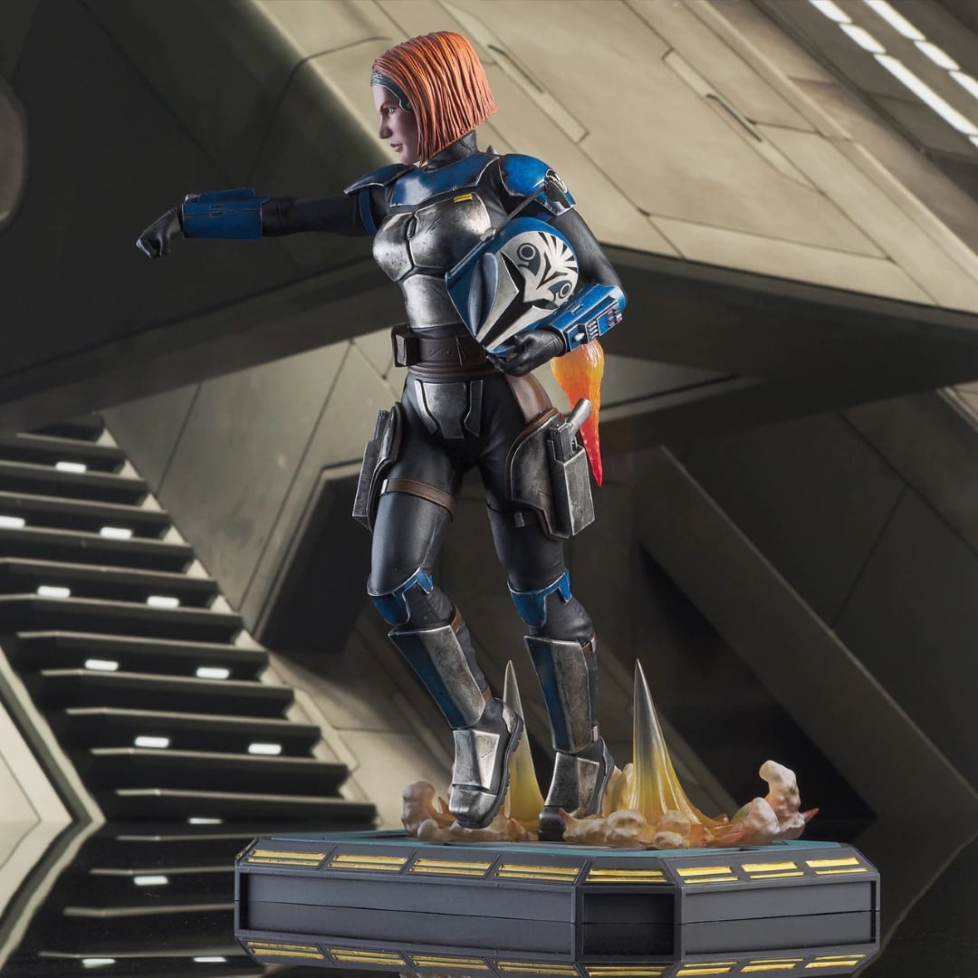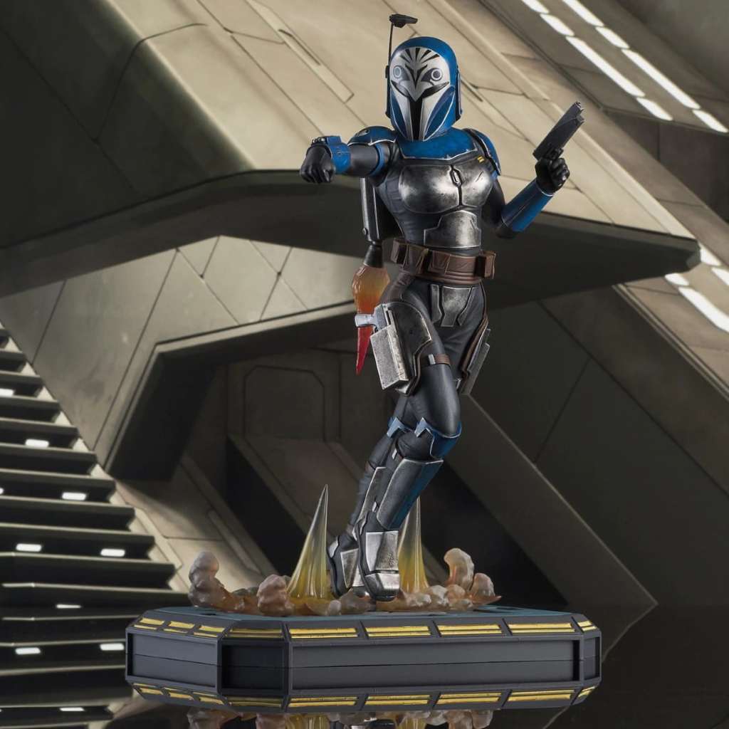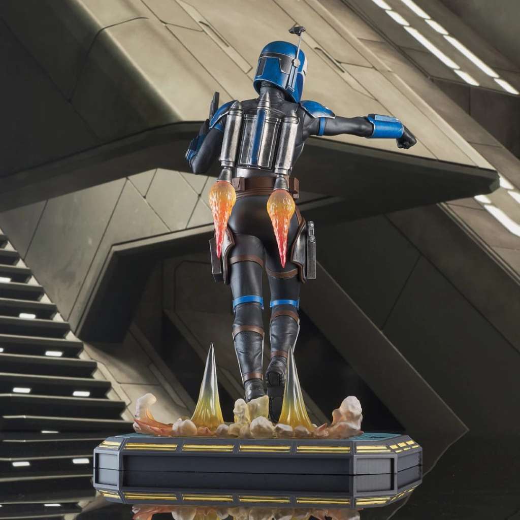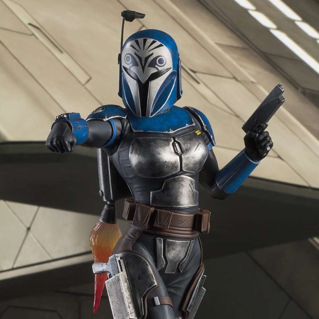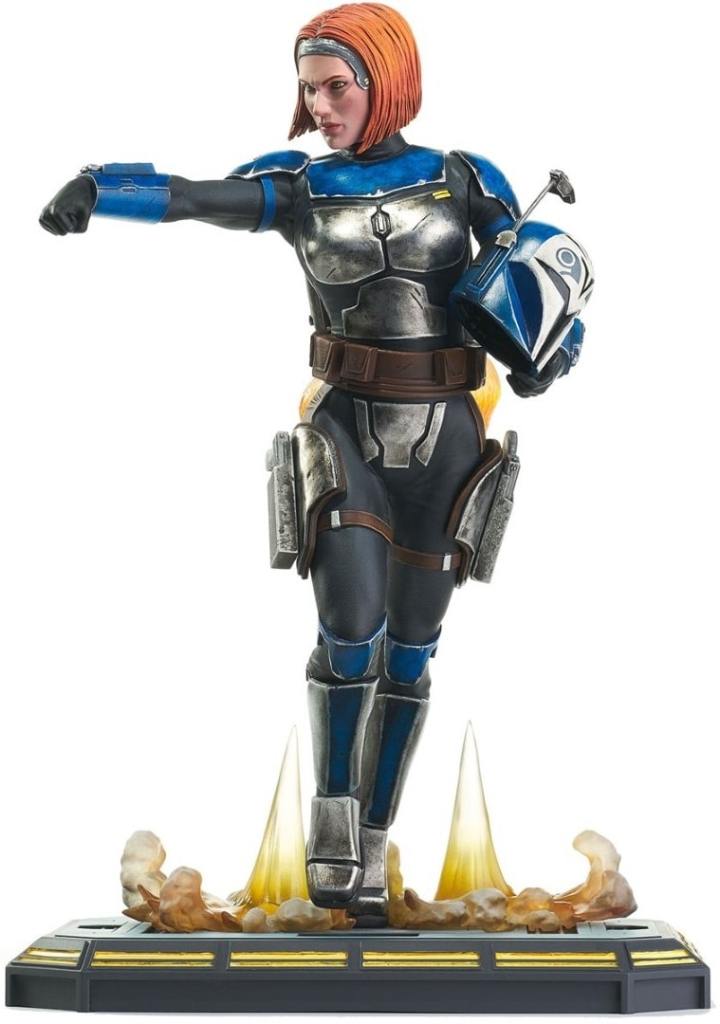 For the glory of Mandalore! Mandalorian freedom fighter Bo-Katan blasts her way into the Premier Collection with this dynamic, customizable statue! Featuring interchangeable helmeted and unhelmeted heads, and alternate helmet-holding and gun-holding arms, Bo-Katan engages her jetpack in this 1/7 scale, approx. 28 cm statue. Limited to only 3000 pieces, it comes packaged with a numbered certificate of authenticity in a full-color box.