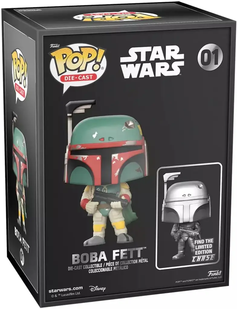 There is a 1 in 6 chance you will find the chase variant of the die-cast Boba Fett in shiny metallic armour (Chase variants are shipped at random. Receiving a chase with purchase is not guaranteed).