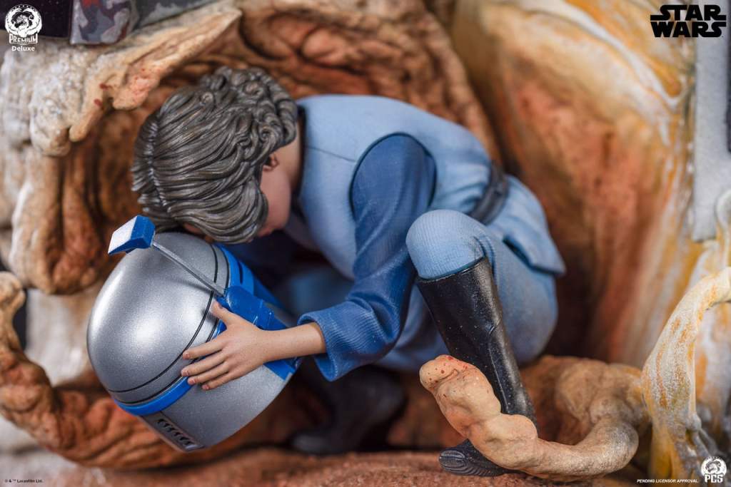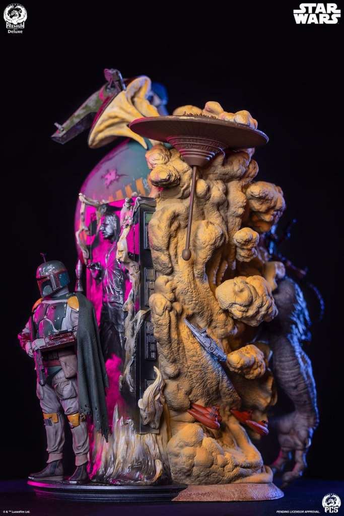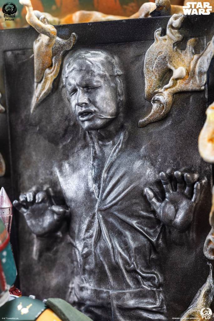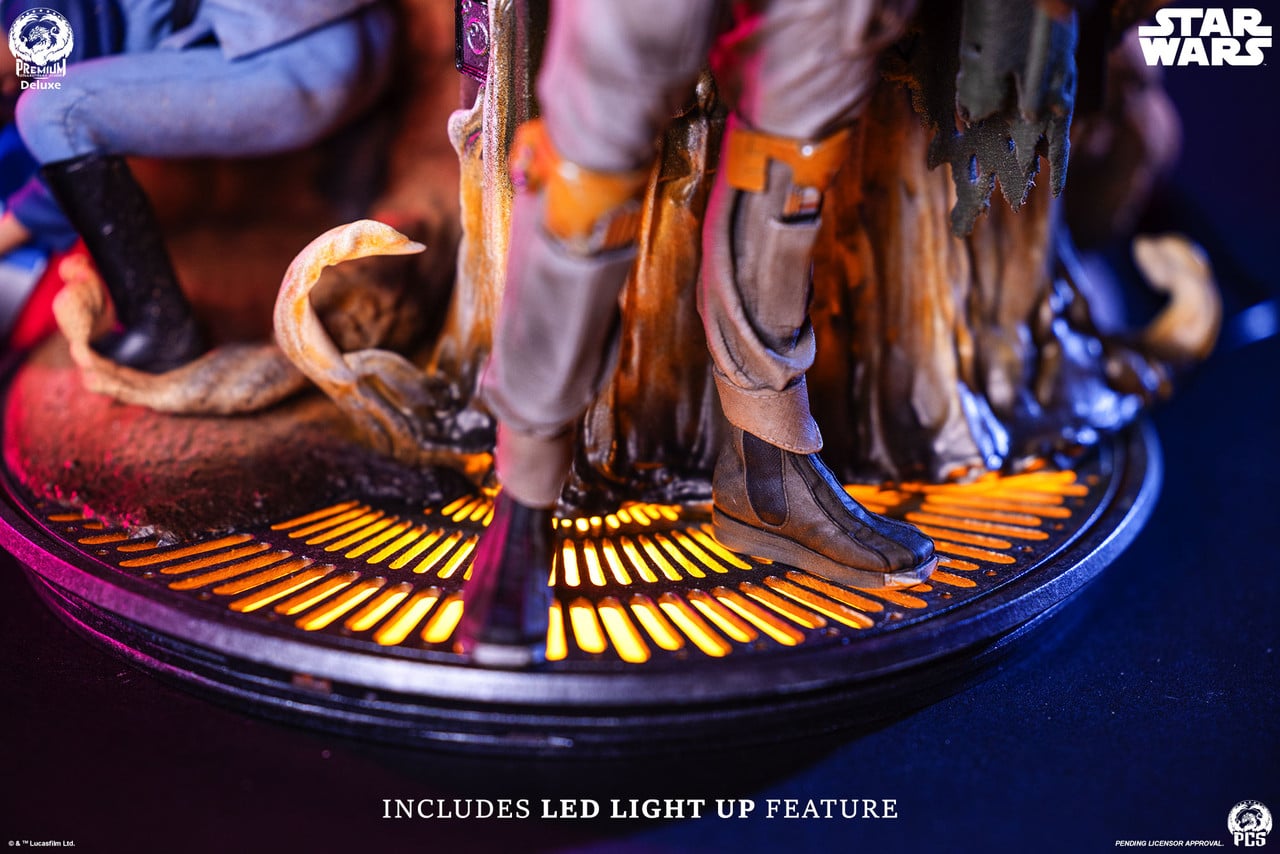The Boba Fett – Fine Art Bust Deluxe Edition features LED light up features to add an extra sense of excitement and drama to this already staggering piece. The warm glow emanating from beneath the floors of the carbonite freezing chamber illuminates a highlight of this piece, a statue of the disquietingly stoic Boba Fett standing beside his frozen quarry.