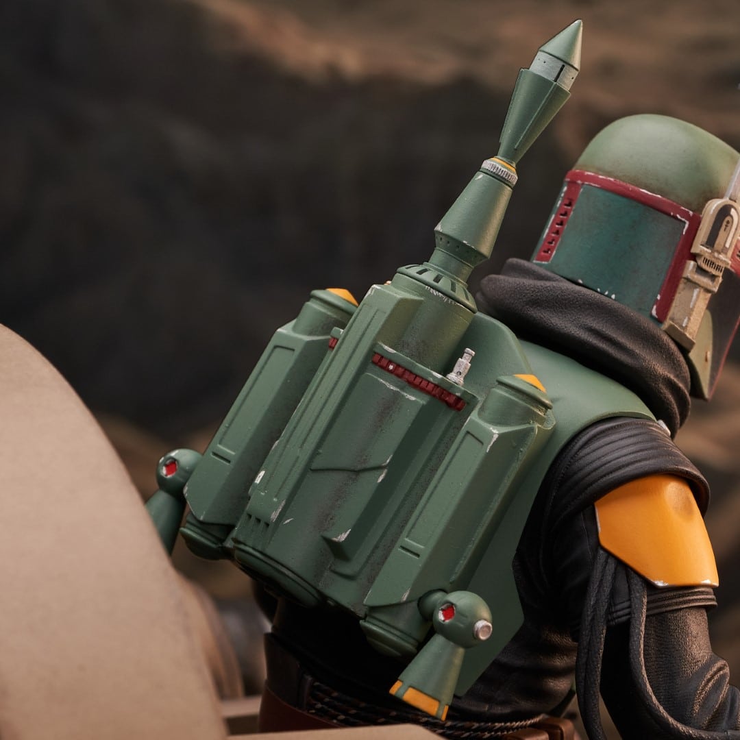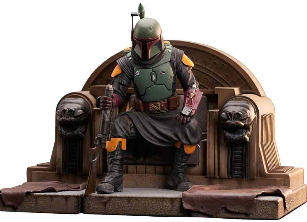 A Gentle Giant Ltd. release! Meet the new boss! Having disposed of Bib Fortuna™ and taken over Jabba’s palace in Season 2 of The Mandalorian, Boba Fett™ is ready to take on all comers in his next adventure! Measuring approximately 12.6 inches wide and 9.4 inches tall, this statue of Boba Fett on Fortuna’s throne features high-definition digital sculpting and hand-painted details. Limited to only 1000 pieces, it comes packaged in a full-color box with a hand-numbered certificate of authenticity. By the talented team at Gentle Giant Ltd.!