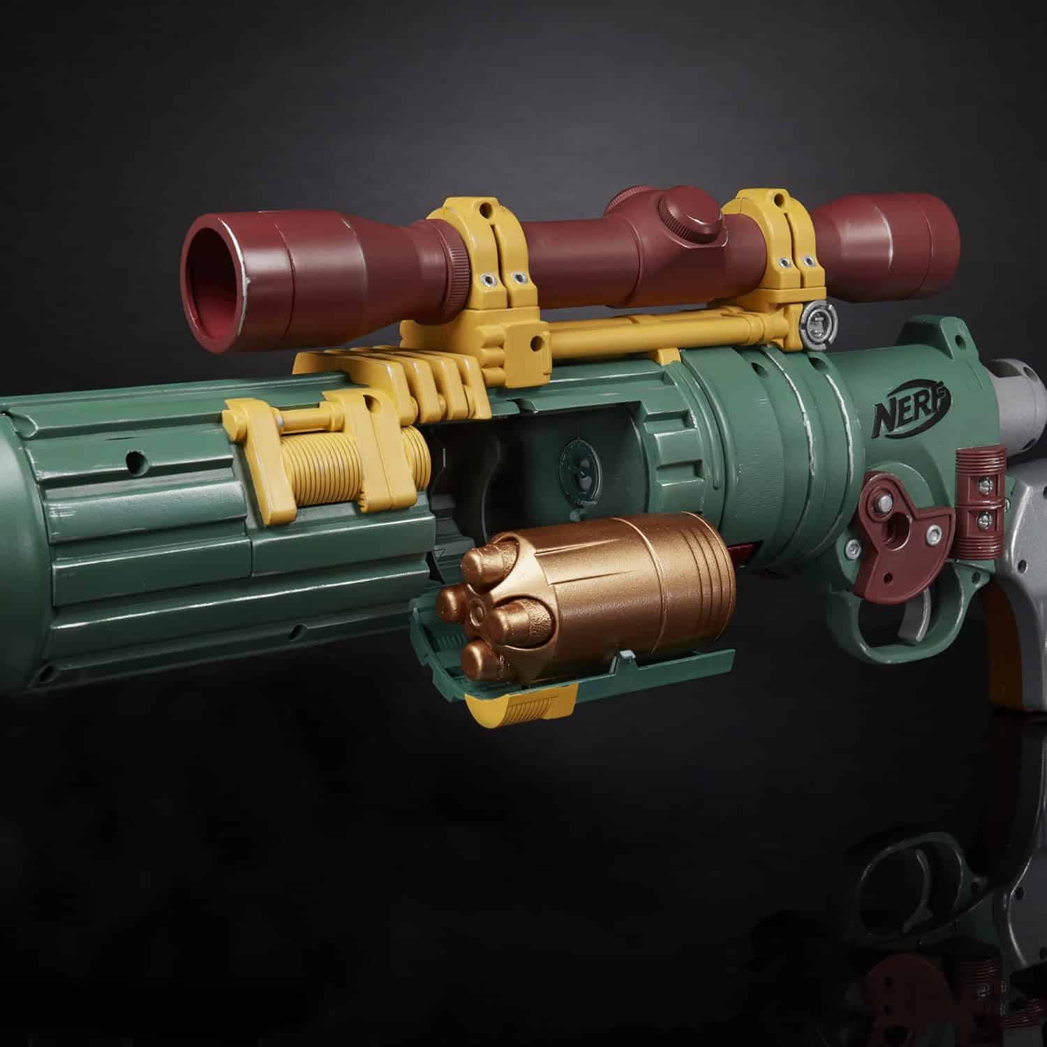 • ENTHÄLT 3 ABNEHMBARE 4-DART TROMMELN: Der Nerf LMTD Star Wars Boba Fett EE-3 Blaster enthält 3 abnehmbare Trommeln, die jeweils 4 Darts fassen. So können die Trommeln schnell ausgetauscht werden, um den Blaster nachzuladen