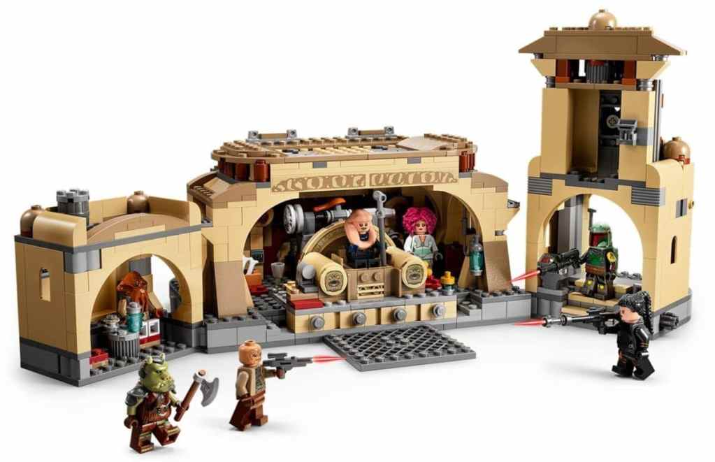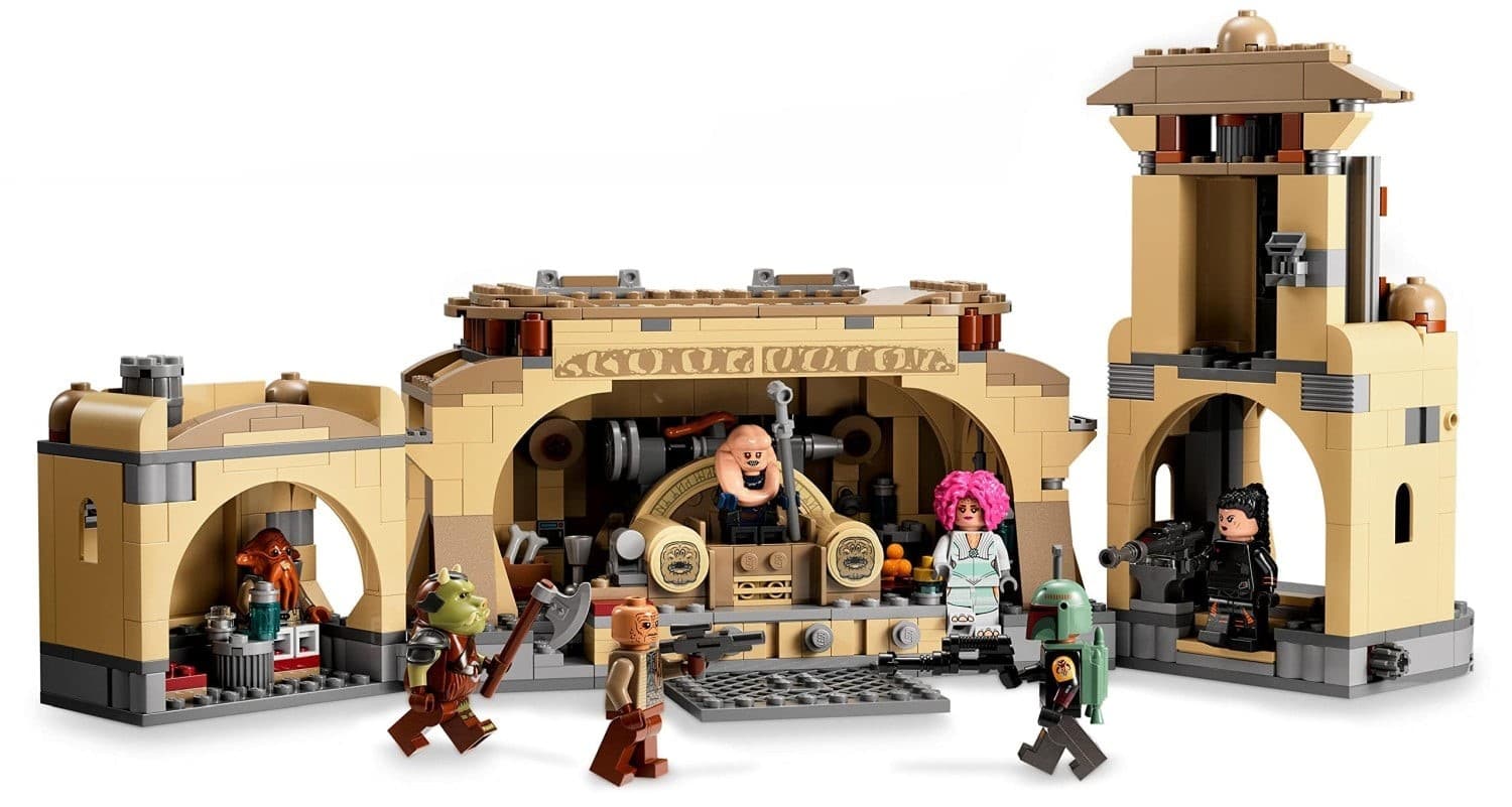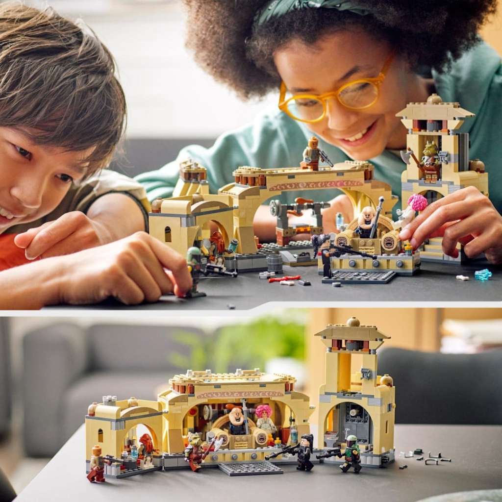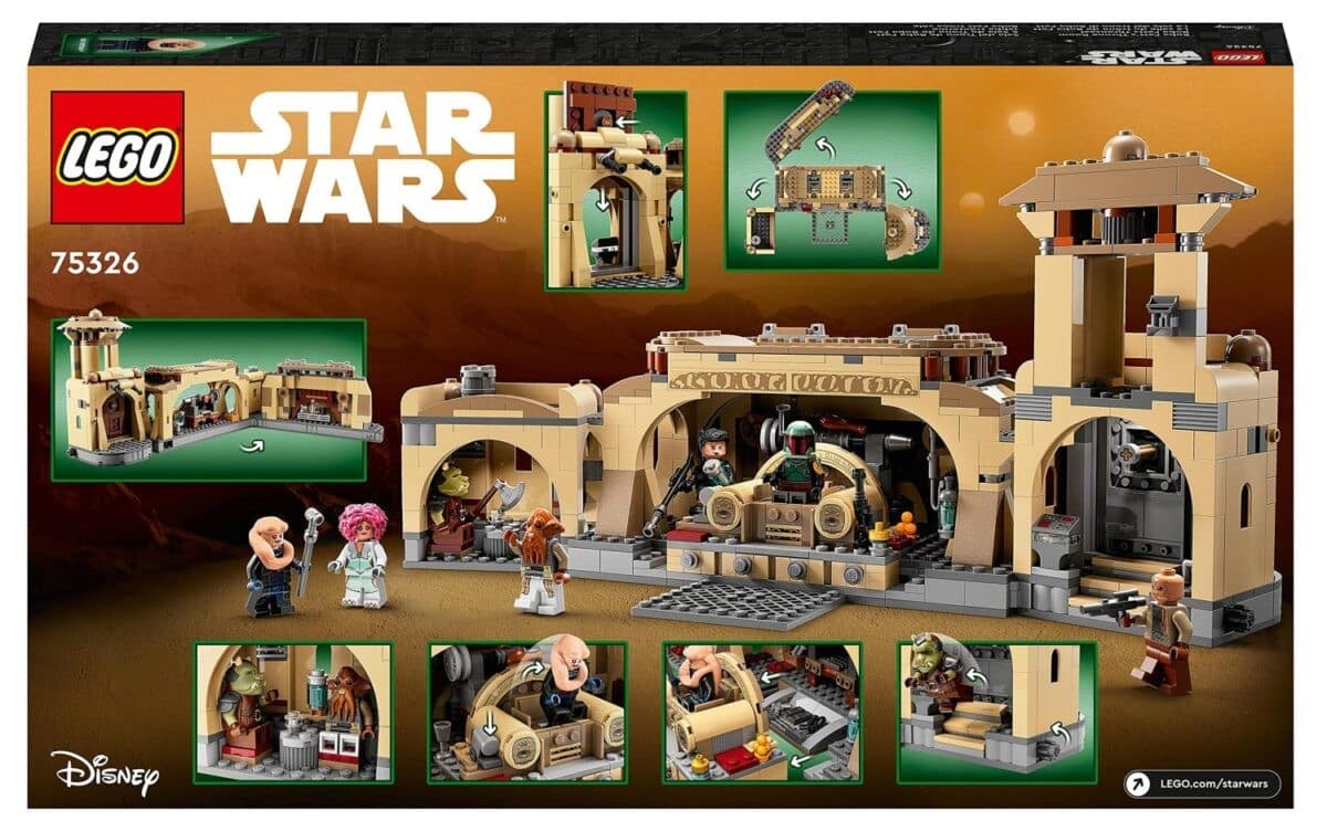 Schreib mit dem Bau- und Spielset „Boba Fetts Thronsaal“ (75326) für Fans ab 9 Jahren neue Kapitel für Star Wars: Das Buch von Boba Fett. Der Palast aus LEGO Steinen lässt sich öffnen, um Zugang zum detailgetreuen Thronsaal, zur Grillecke und zur Küche zu erhalten. Im Thron verbergen sich ein Geheimfach und eine Popup-Funktion, um Bib Fortuna herausschnellen zu lassen. Auch Kippstufen, ein aufklappbares Tor und jede Menge Zubehör laden zum Spielen ein.