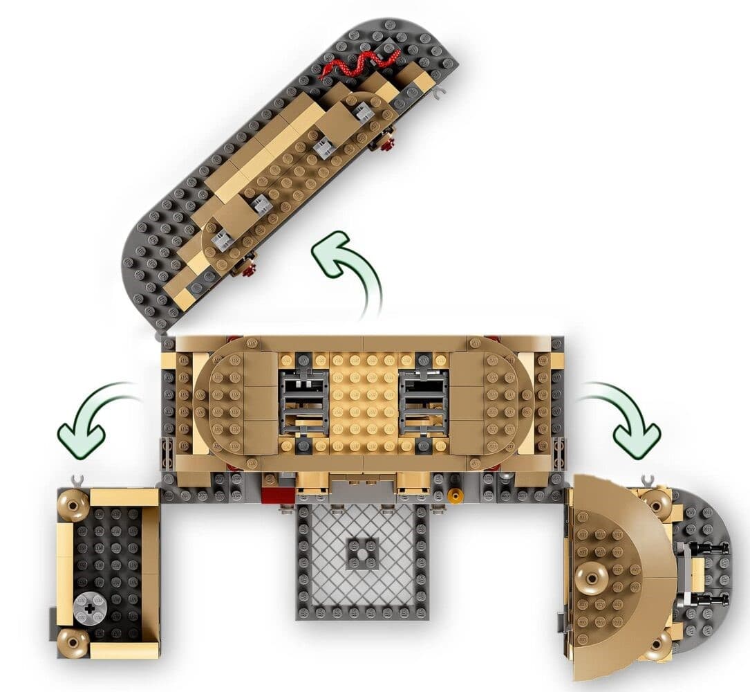 • Tolle Spielfunktionen: Thron mit einem Geheimfach für Waffen und Beskarbarren und einer Popup-Funktion, um Bib Fortuna herausschnellen zu lassen, Rüttelstufen, um einen Wächter stürzen zu lassen und ein aufklappbares Tor