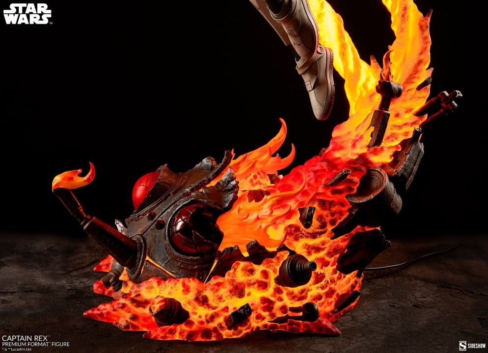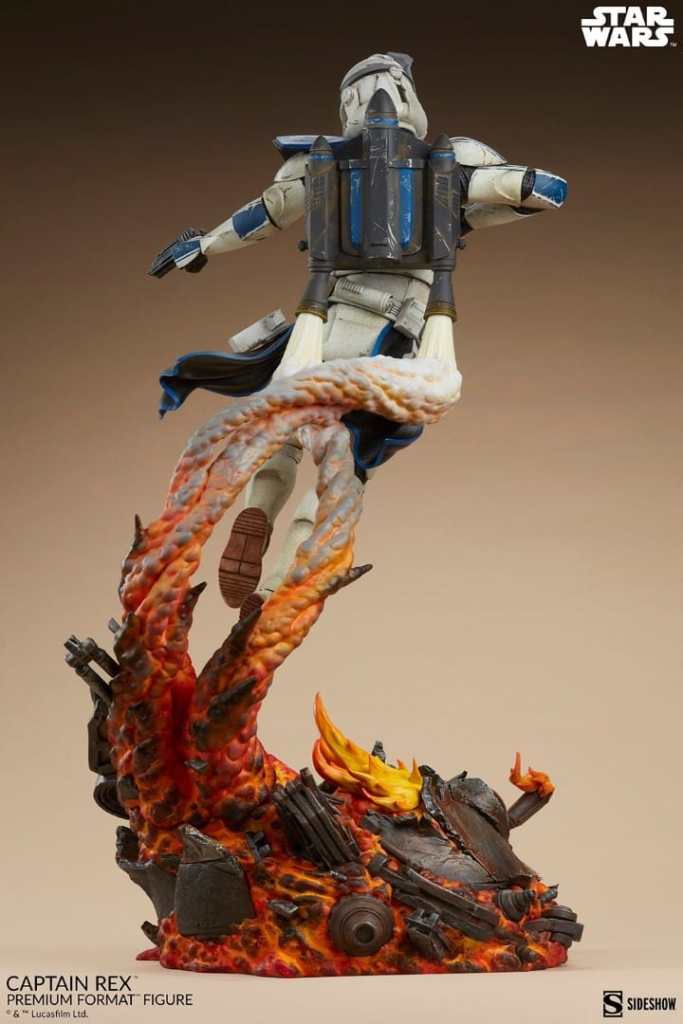 Measuring 27” tall, 15” wide, and 15” deep, the Captain Rex Premium Format Figure wields dual blasters as he launches into the air above a scorched battlefield. Gray and white smoke plumes twist into the vibrant yellow and orange flames emitted from his jet pack. A broken and burned spider droid™, its pieces scattered and melted in the aftermath, bears the brunt of Captain Rex’s effective assault. With this trooper in the sky, the victory of the Republic’s campaign seems certain.