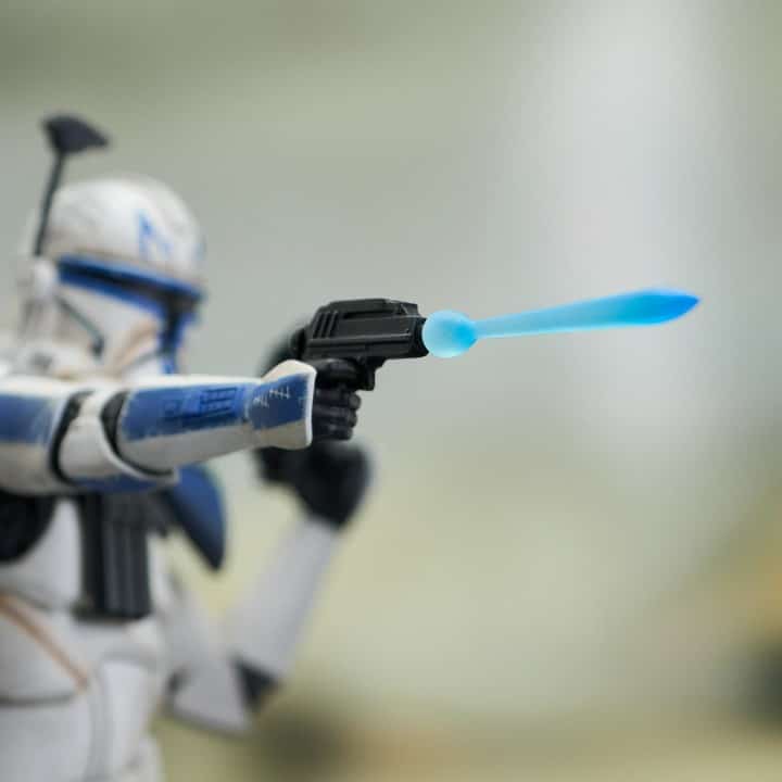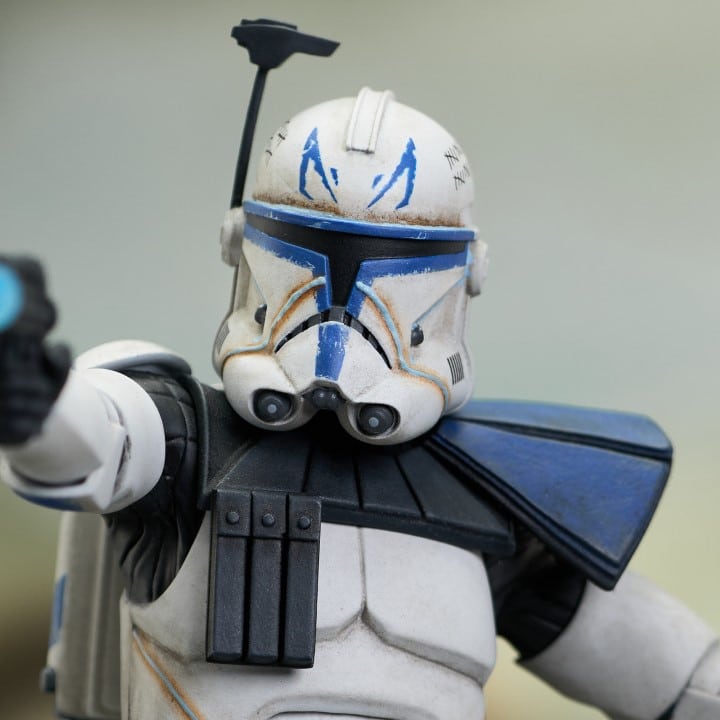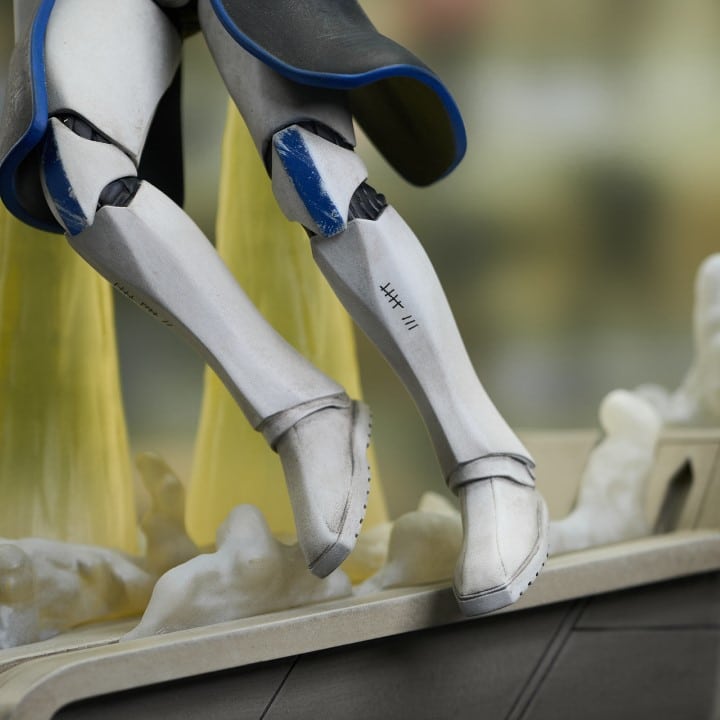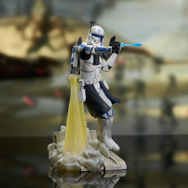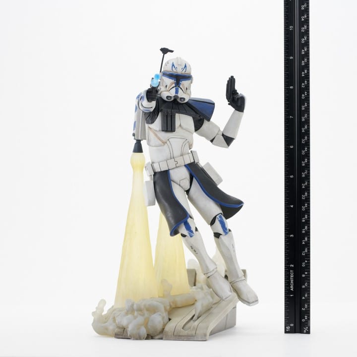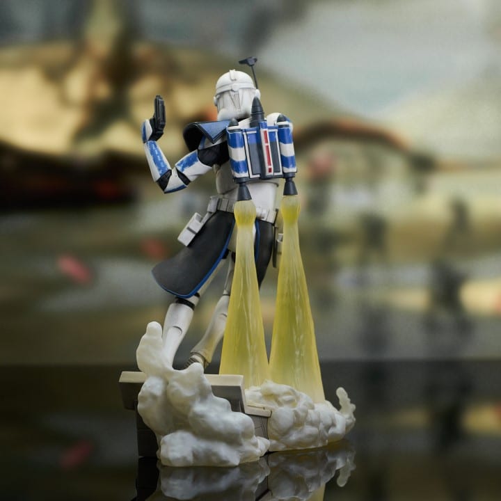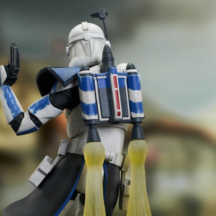 A Gentle Giant LTD release! Captain Rex blasts into action in the newest Star Wars Gallery PVC statue! Lifting off with the thrusters of his jetpack at full power, firing one blaster with his other blaster at the ready, this dynamic statue of Captain Rex is based on his appearance in The Clone Wars, and features detailed sculpting and paint applications. It comes packaged in a full-color window box.