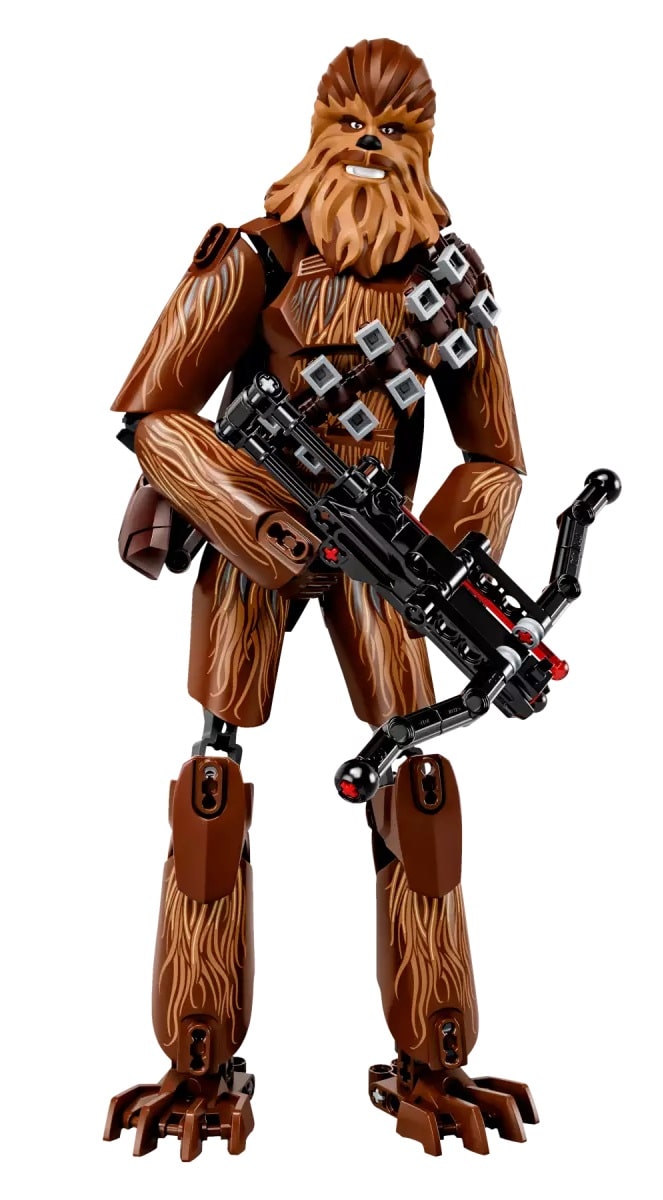 - Die baubare und äußerst bewegliche Figur besitzt eine Verzierung, die Chewbaccas „Fell“ darstellt, und einen detailreichen Kopf. Der Gurt mit den Pfeilen und die Tasche können abgenommen werden. Außerdem trägt die Figur einen Bowcaster mit federunterstütztem Shooter.