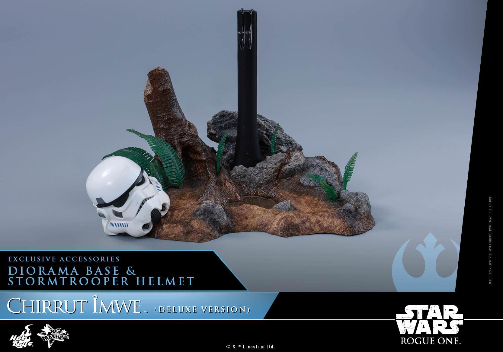 Furthermore, in celebration of the famed Hong Kong actor and martial artist Donnie Yen starring as the spiritual warrior Chirrut, Hot Toys is excited to present a special Deluxe version of the 1/6th scale Chirrut Îmwe only available in selected markets. This Deluxe Version will exclusively include a diorama figure base with a Stormtrooper helmet and a special package design inspired by traditional Asian art!