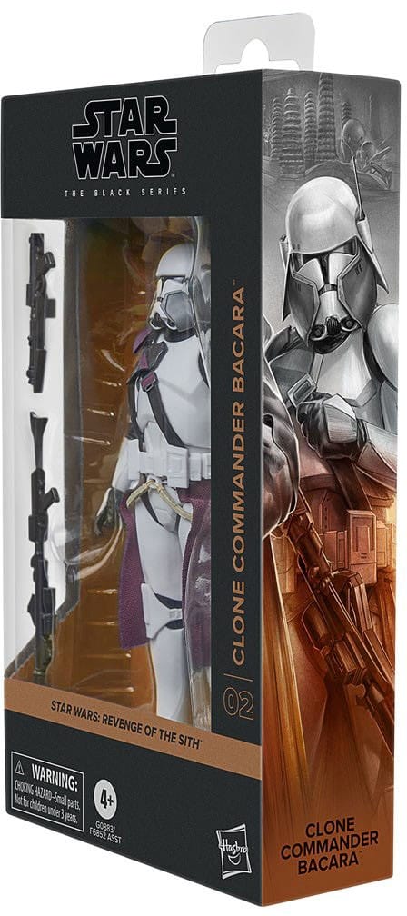 Known for his aggressive tactics, Clone Commander Bacara led the Galactic Marines — a unit of clone troopers famous for their distinctive armor and relentlessness in combat. STAR WARS: THE BLACK SERIES includes 6-inch action figures, vehicles, and roleplay items from the 40-plus-year legacy of the STAR WARS Galaxy, letting fans create galactic scenes with a faithfulness to STAR WARS comic books, movies, and series. This STAR WARS action figure is detailed to look like Clone Commander Bacara from the classic film STAR WARS: REVENGE OF THE SITH. Display STAR WARS fandom on your shelf with window box packaging featuring sleek character art. Features a poseable head, arms, and legs so fans can create dynamic poses for display and comes with 2 blaster accessories.