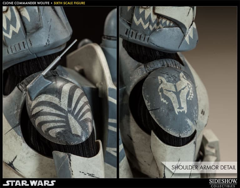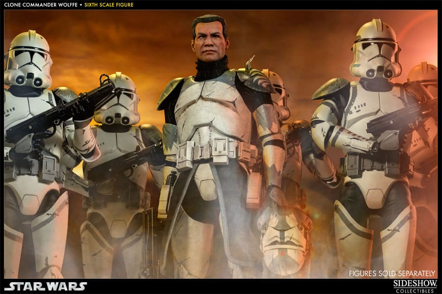 Sideshow Collectibles presents the Clone Commander Wolffe Sixth Scale Figure. Inspired by his appearances in Star Wars – The Clone Wars, the leader of the 104th Battalion’s famed Wolfpack joins the ranks of Sideshow’s Militaries of Star Wars. CC-3636 comes loaded with four interchangeable heads, a complete arsenal, and a full range of articulation.