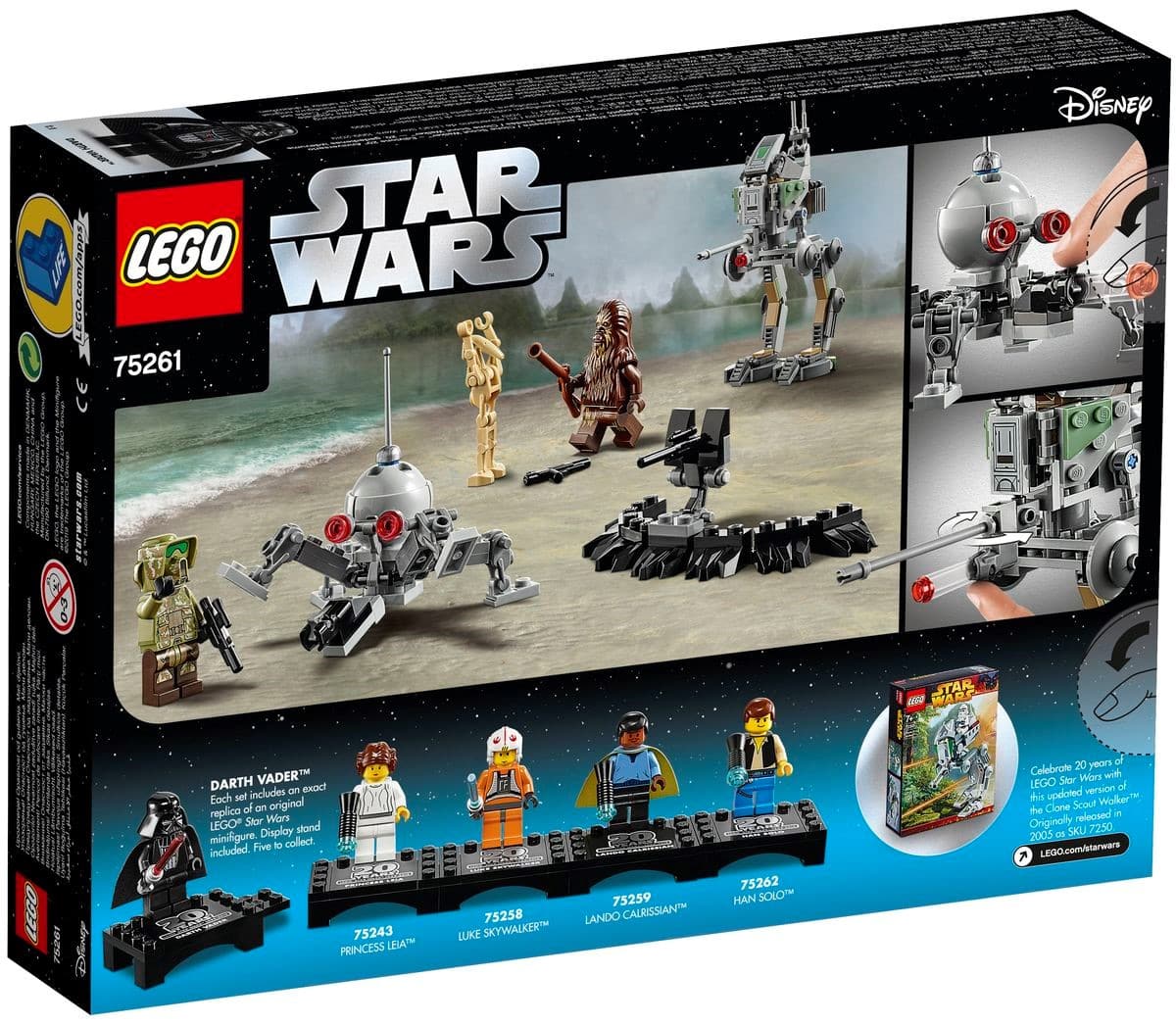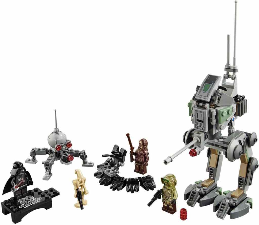 - Das Set enthält drei LEGO® Star Wars™ Minifiguren: einen Kashyyyk-Truppler, einen Wookiee sowie eine Bonus-Minifigur von Darth Vader zum 20. Jubiläum auf einer abtrennbaren Präsentationsplatte sowie eine LEGO Figur von einem Kampfdroiden.