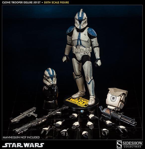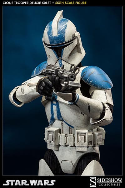 Sideshow presents the Clone Trooper Deluxe: 501st Legion, an elite legion of clone troopers serving under commanding officer Captain Rex, and one of the most well-recognized battalions in the Republic Army. Troopers from the prestigious 501st are distinguished by the trademark blue markings on their battle armor. The Clone Trooper Deluxe: 501st is crafted on a fully articulated body and features interchangeable Phase One and Two helmets, along with an arsenal of essential munitions.