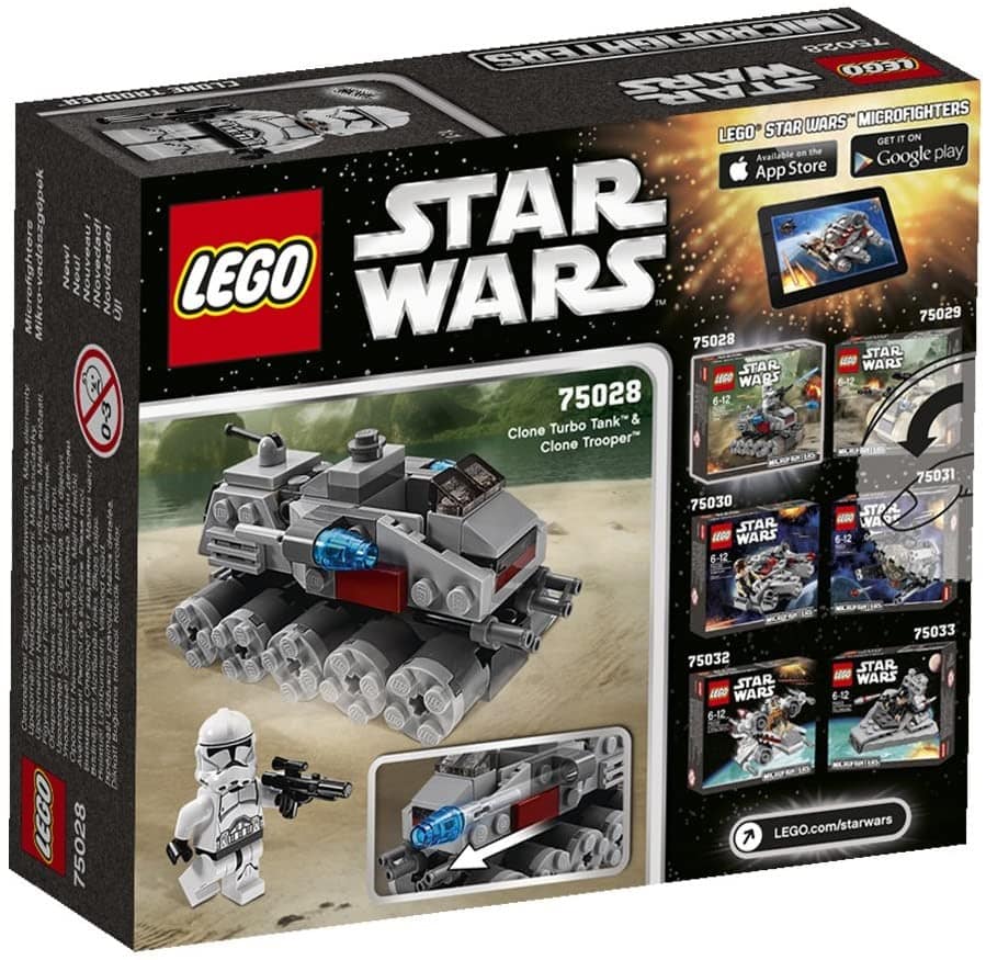 Entdecke mit dem Clone Turbo Tank™ die Mini-Welt der LEGO® Star Wars™ Microfighters. Dieses coole Mini-Modell verfügt über bewegliche Räder, 2 Raketen und ein Mini-Cockpit für den Clone Trooper™. Mach dich bereit für die Schlacht in Mikro-Größe! Enthält eine Clone Trooper Minifigur mit Blaster.
