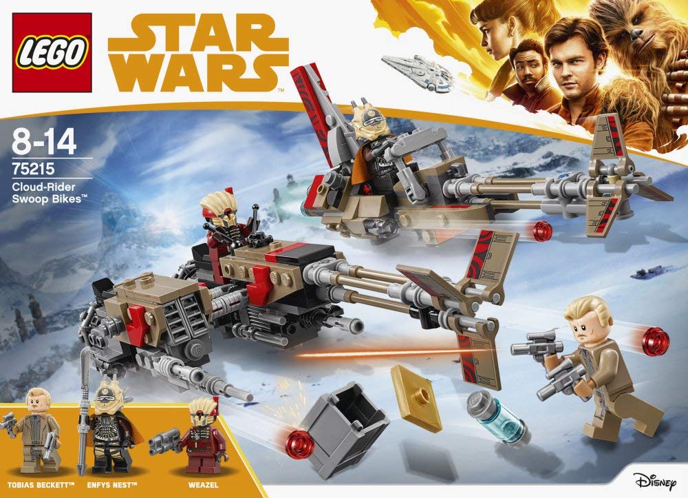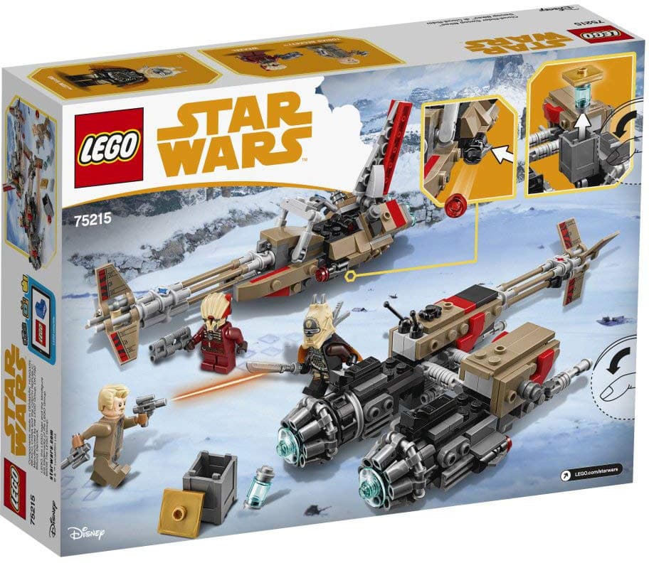 - Enthält 2 schnittige Swoop Bike Speeder, die jeweils über ein aufklappbares Minifiguren Cockpit und Shooter verfügen. An einem der Speeder ist sogar ein Beiwagen befestigt, um den Kanister mit dem Coaxium verstauen zu können.