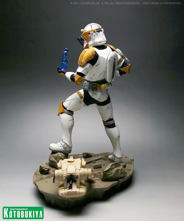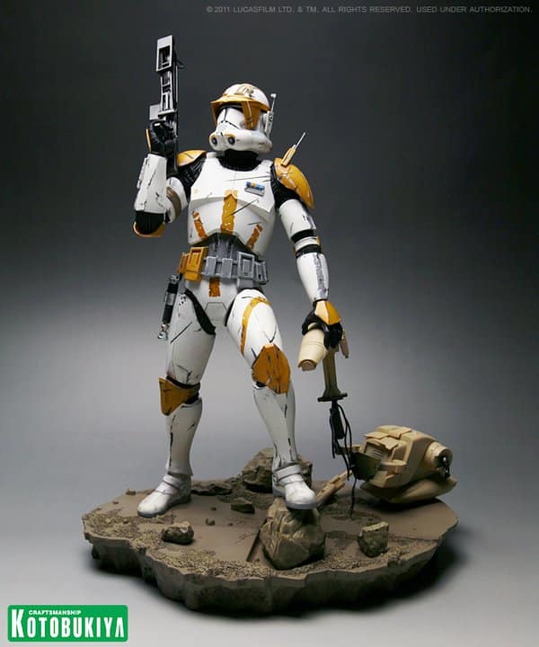 A Kotobukiya Japanese import! The recently resurrected line of Star Wars ARTFX Statues (bringing the heroes and villains of the Star Wars universe to life in dynamic 1/7th scale) continues with one of the most popular characters from the prequel films. A leader of clone troopers and friend to Obi-Wan Kenobi until Order 66, here comes Episode III: Revenge Of The Sith Commander Cody! Designated unit 2224, the clone trooper who would one day play such a prominent role in history excelled in an advanced training program and was able to give himself a name: Cody. He quickly rose through the ranks, eventually leading the orange-accented 212th Attack Battalion alongside Jedi Master Obi-Wan Kenobi. His most fateful battle would take place on Utapau, where the Clone Commander would turn his sights from General Grievous to Kenobi himself!