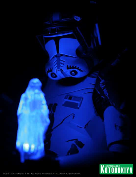 Commander Cody is instantly recognizable even among countless clone troopers by his unique armor modifications and color scheme. His complex helmet and shoulder-mounted antenna feed him up to the minute battle data, while the orange and white proudly pronounce his membership in the 212th. Paying homage to Cody’s switch in allegiance, his ARTFX Statue comes with two unique display modes. The first depicts the commander before Order 66, standing triumphant on the field of battle with his blaster at the ready. Cody scans the scene before him looking for any final opponents while dangling from his left hand are the remains of the last one: the severed head of a battle droid! If you prefer the commander working for the dark side, swap out parts to portray him in the final moment before turning on Obi-Wan. This Cody looks down at a hologram of Emperor Palpatine that glows with a bright LED light! He even wears the Jedi’s lightsaber on his belt as the character did in that specific scene.