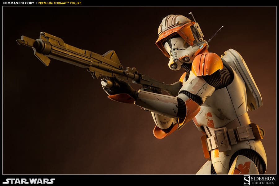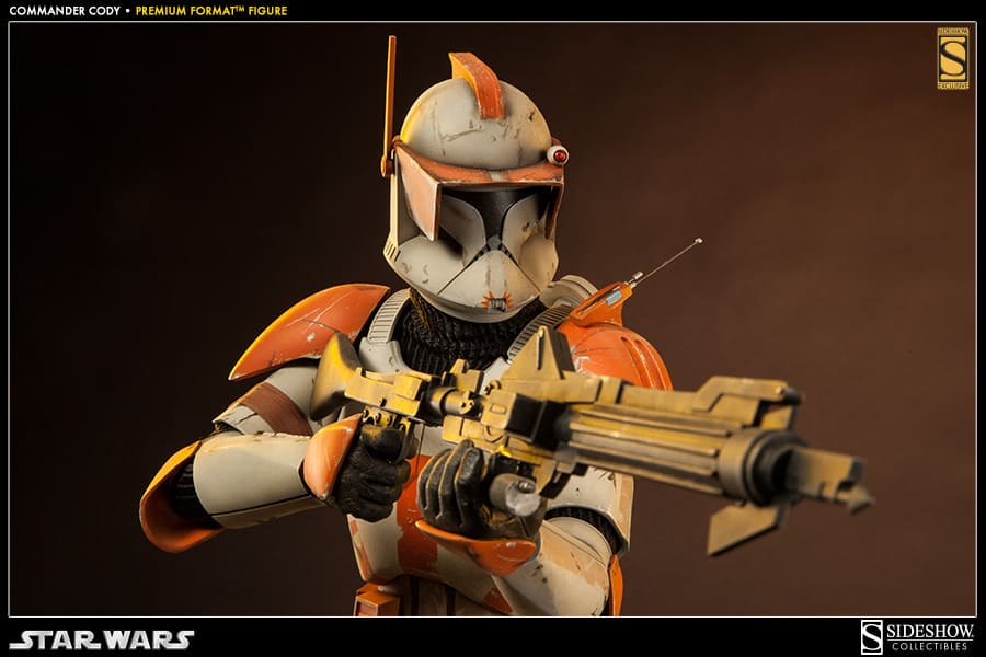 Our dynamic Premium Format figure wears a phase II bucket and detailed armor bearing the distinctive markings of Cody’s famed unit. Leading the charge, he hits the battlefield armed with a DC-15 A Blaster Rifle complete with detachable grappling hook.