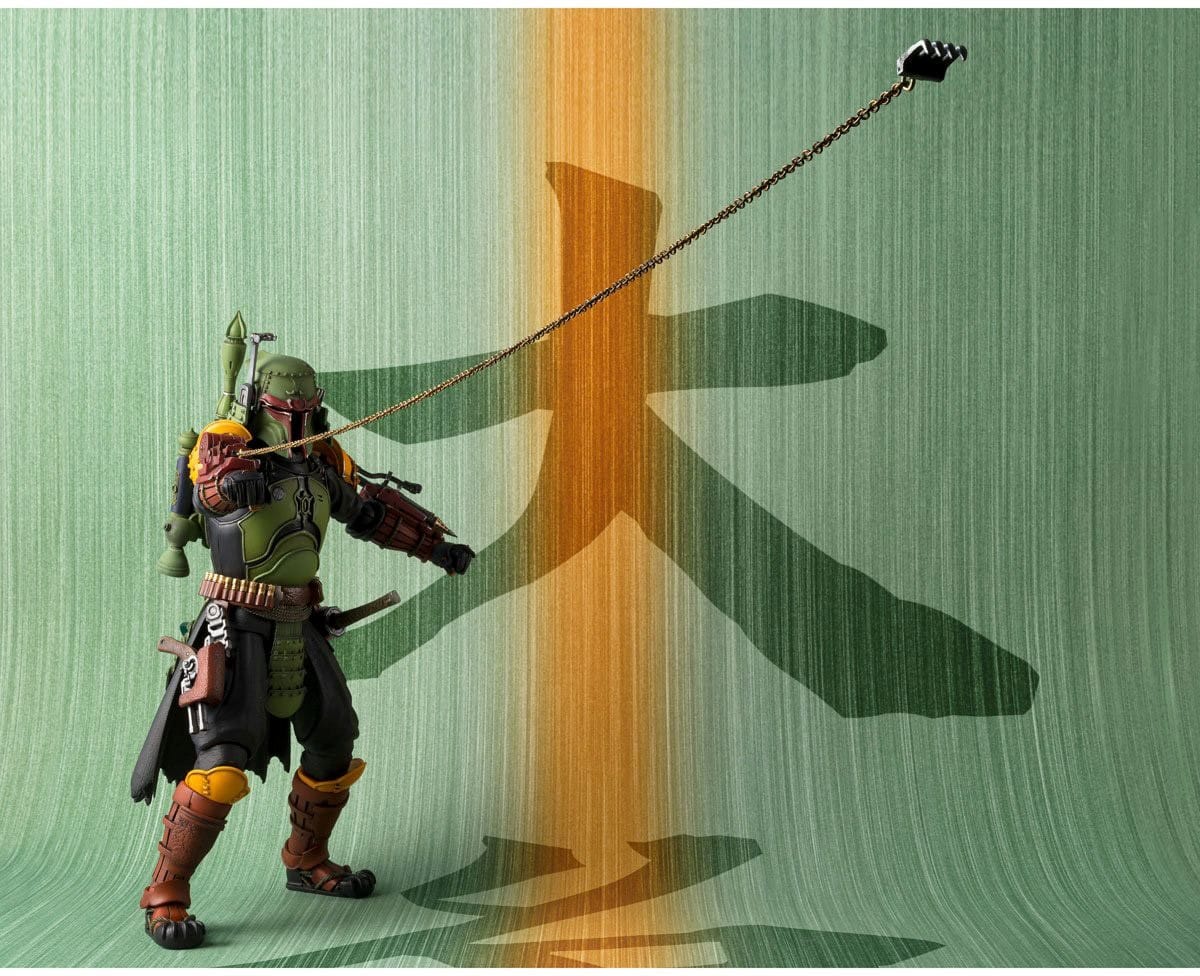 In addition to his standard rifle and blaster armaments, this figure will also include a Meisho-style version of the Gaffi™ Stick gifted to him in the series by the Tusken Raiders™. Boba Fett’s infamous fibercord cable, which fires from his right arm gauntlet, has also been reimagined as a chain weapon with a small claw at the end for capturing his foes.