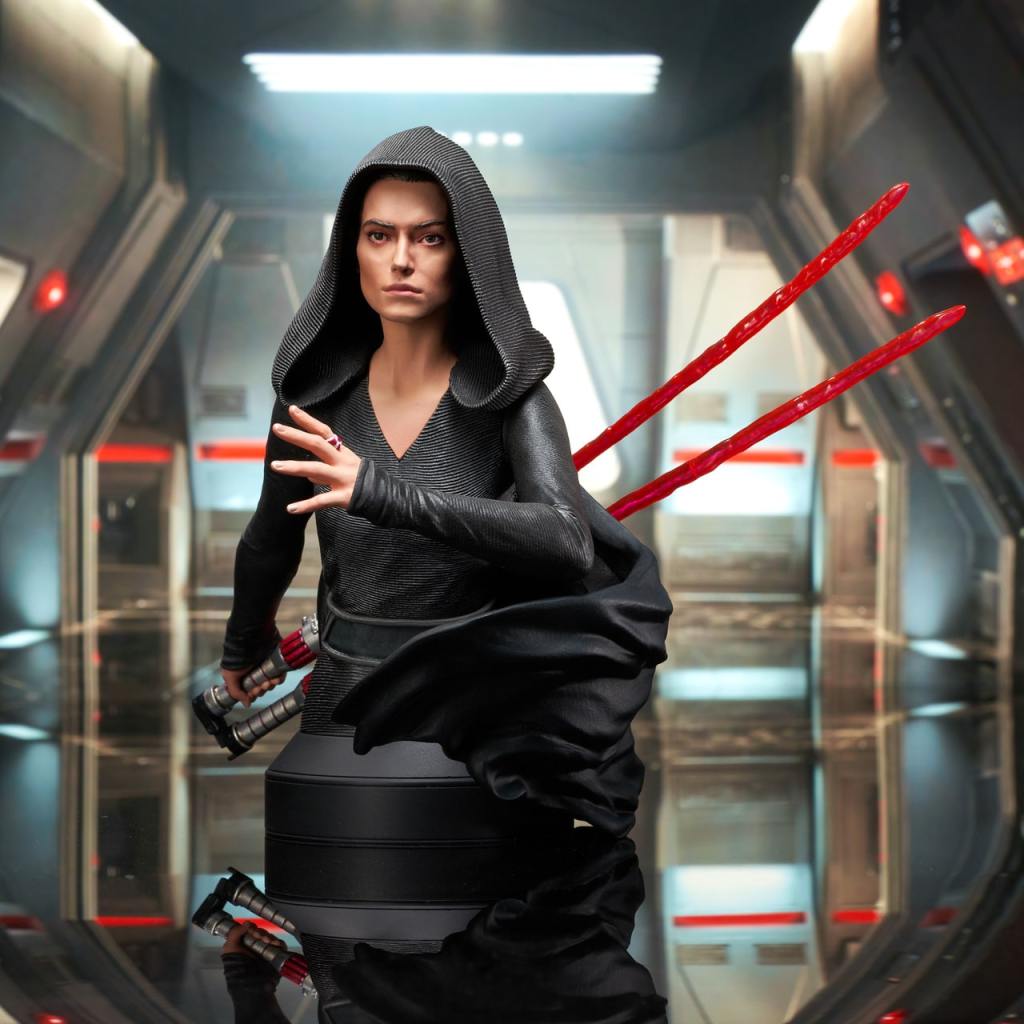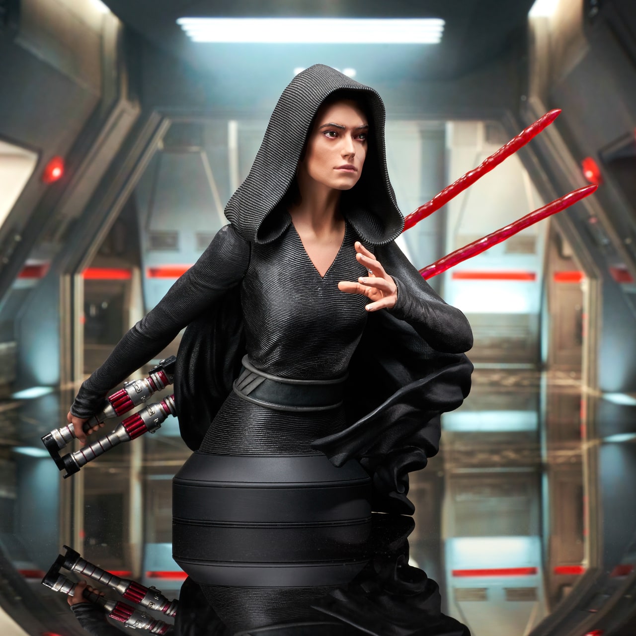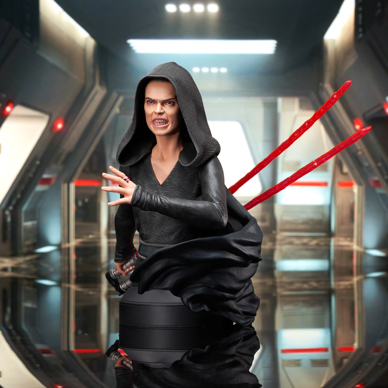 A Gentle Giant Ltd. Release! A good mini-bust goes to the Dark Side in this all-new 1/6 scale Star Wars collectible! Jedi-in-training Rey gets a glimpse of her life as the disciple of Emperor Palpatine in the ninth Star Wars movie, wielding a menacing double-bladed lightsaber, and now that moment has been captured as a highly detailed 6-inch sculpture! Limited to only 2500 pieces, this New York Comic-Con exclusive features two interchangeable heads, and comes packaged in a full-color box with a numbered certificate of authenticity.