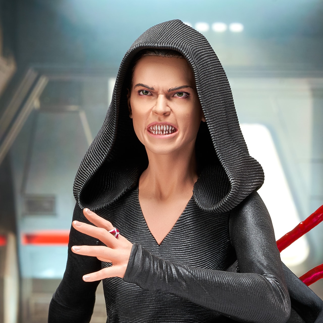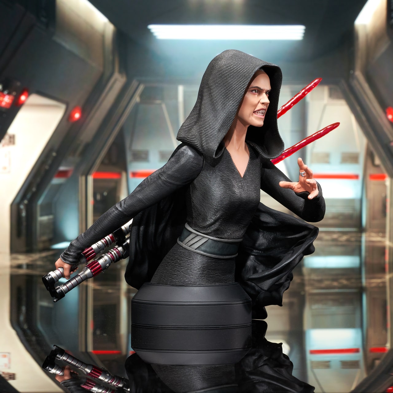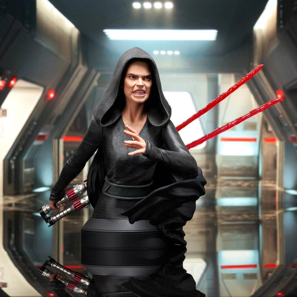 A Gentle Giant Ltd. Release! A good mini-bust goes to the Dark Side in this all-new 1/6 scale Star Wars collectible! Jedi-in-training Rey gets a glimpse of her life as the disciple of Emperor Palpatine in the ninth Star Wars movie, wielding a menacing double-bladed lightsaber, and now that moment has been captured as a highly detailed 6-inch sculpture! Limited to only 2500 pieces, this New York Comic-Con exclusive features two interchangeable heads, and comes packaged in a full-color box with a numbered certificate of authenticity.