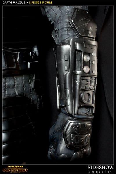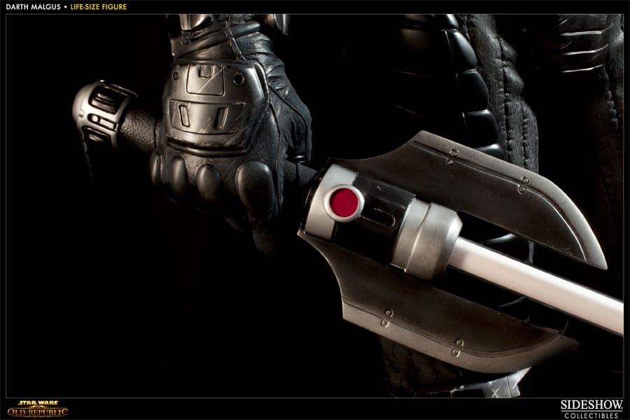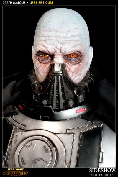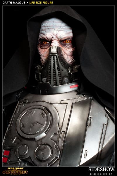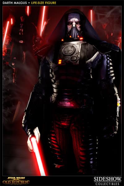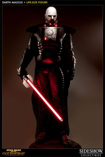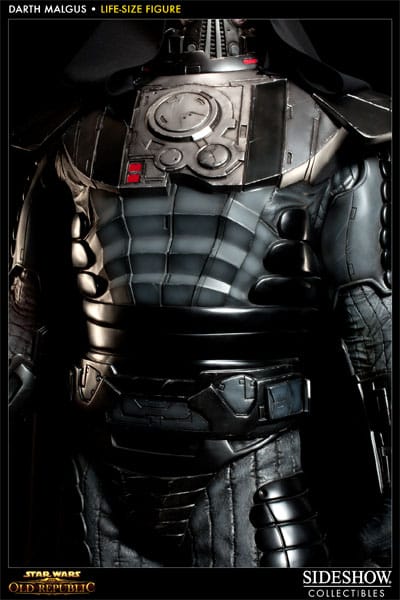 Sideshow Collectibles is proud to present the Darth Malgus Life Size figure. Capturing the vicious Sith Lord of The Old Republic in startlingly realistic 1:1 scale, the looming figure measures over 7 feet tall and more then 3 feet wide. Each piece is individually hand painted and finished to exacting standards, the trademark of a handcrafted Sideshow Collectibles product. Featuring an LED lit Lightsaber (TM), LED light up components in the chest, collar, and wrist gauntlets, highly detailed armor, and a real fabric hooded cape; the Darth Malgus Life Size figure makes a spectacular addition to any collection.