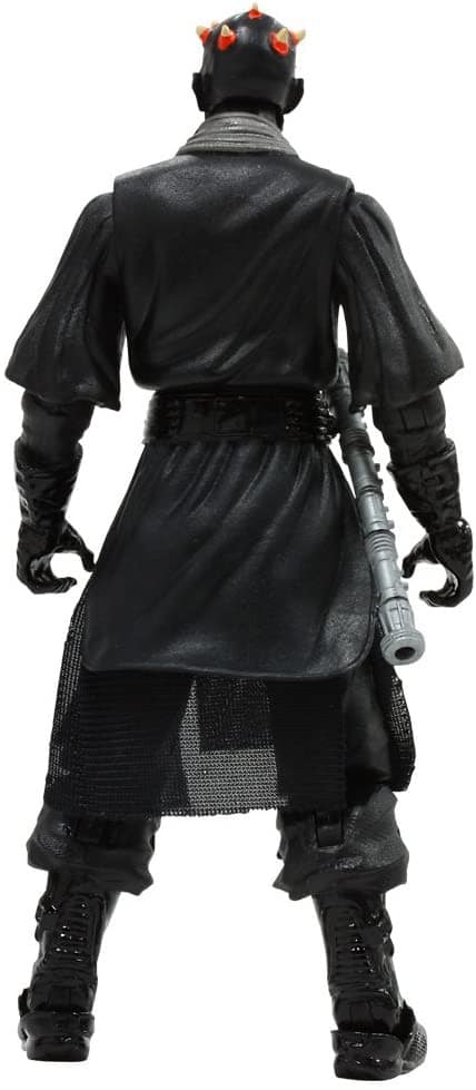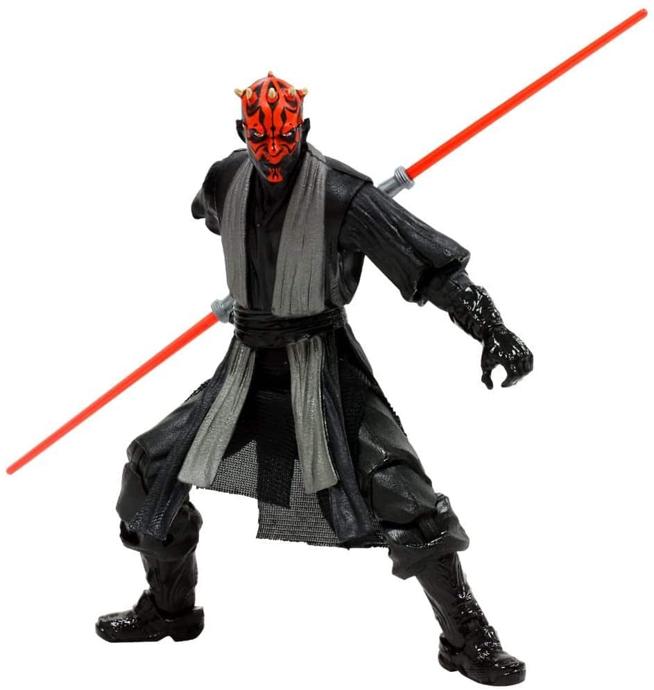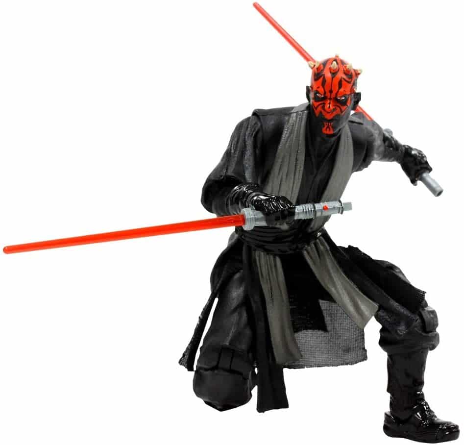 The evil Sith apprentice Darth Maul engages in a fierce lightsaber duel with Qui-Gon Jinn and Obi-Wan Kenobi.
