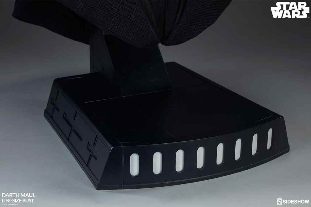 The Darth Maul Life-Size Bust is crafted from fiberglass and also includes a fabric inner robe and hood, which can be displayed up or down over Maul’s head, giving you an additional display option for presenting this piece in your home.