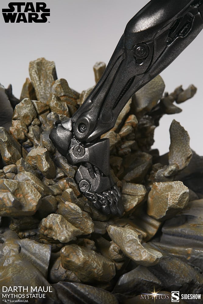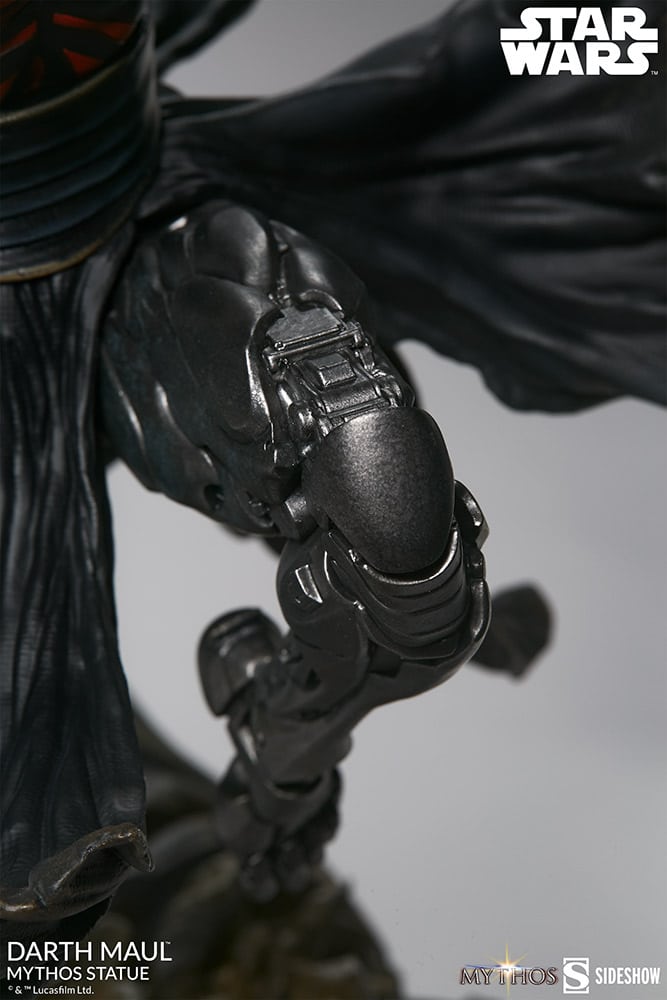 The Darth Maul Mythos Statue measures 23.5″ tall, as the hateful Zabrak warrior leaps from the crumbling ruins of a Sith temple monument, wielding his famed dual-bladed red lightsaber. In a savage rage, Maul prepares to enact his revenge on the accursed Jedi Order, the ones who took his legs and left him near death.