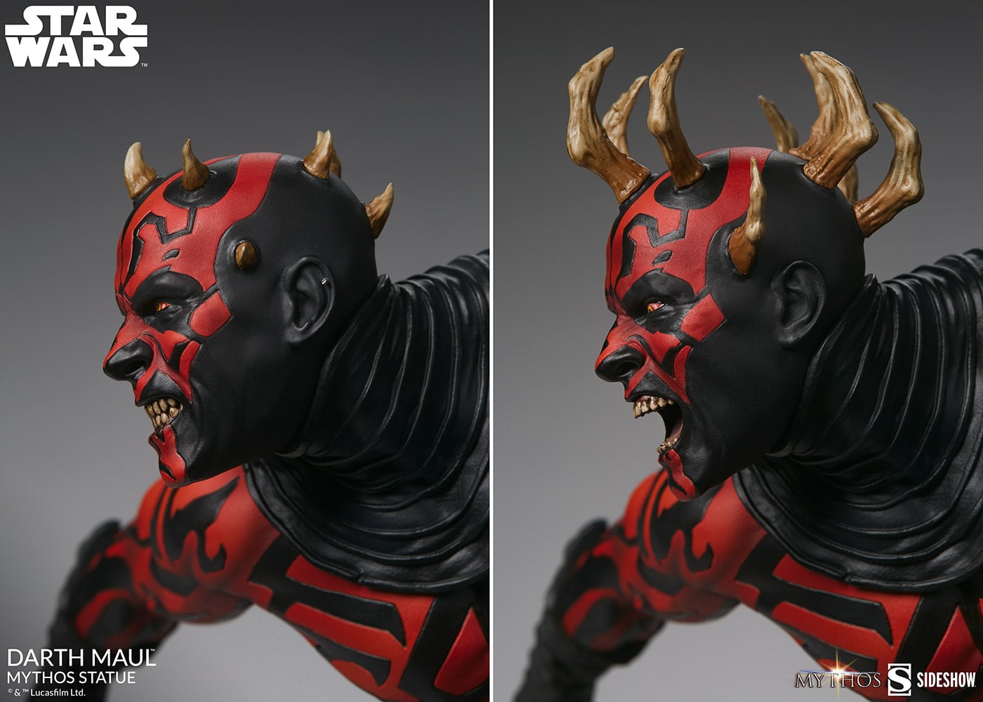 The polystone Darth Maul Mythos Statue features a fully sculpted costume composed of weathered black skirts, belts, arm wraps, and a black collar. As a result of his fateful duel with Obi-Wan Kenobi, the Dathomirian Sith now has powerful, highly detailed robotic legs that allow him to hunt his Jedi prey with animalistic precision. Darth Maul is also covered in customary Zabrak markings, creating his signature red and black appearance. This dynamic statue also includes two portraits for collectors to choose from; one grimacing head with shortened horns, and one raging head with longer horns.