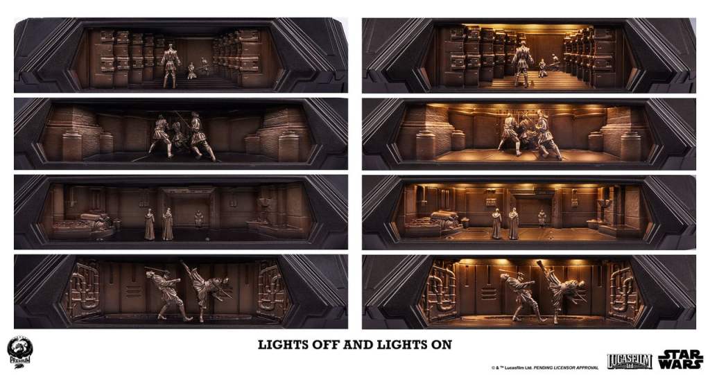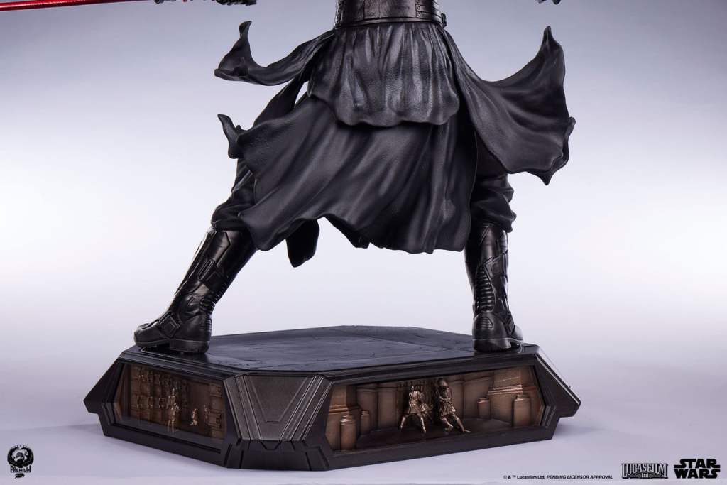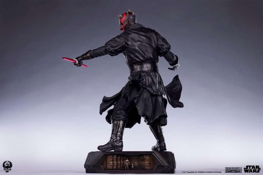 The Darth Maul 1:3 statue stands atop a pedestal style base decorated with four unique relief scenes with dramatic overhead LED lighting, each depicting important scenes from the classic STAR WARS: EPISODE I – THE PHANTOM MENACE.