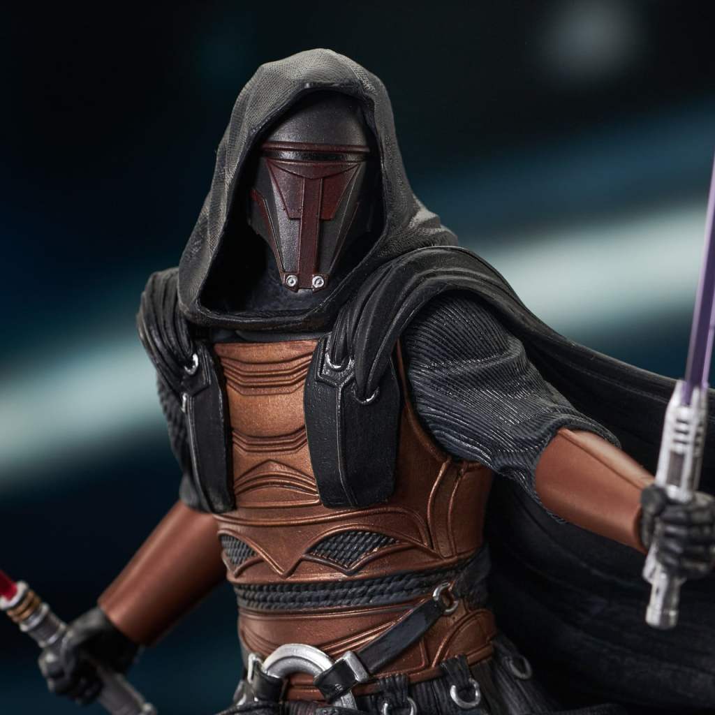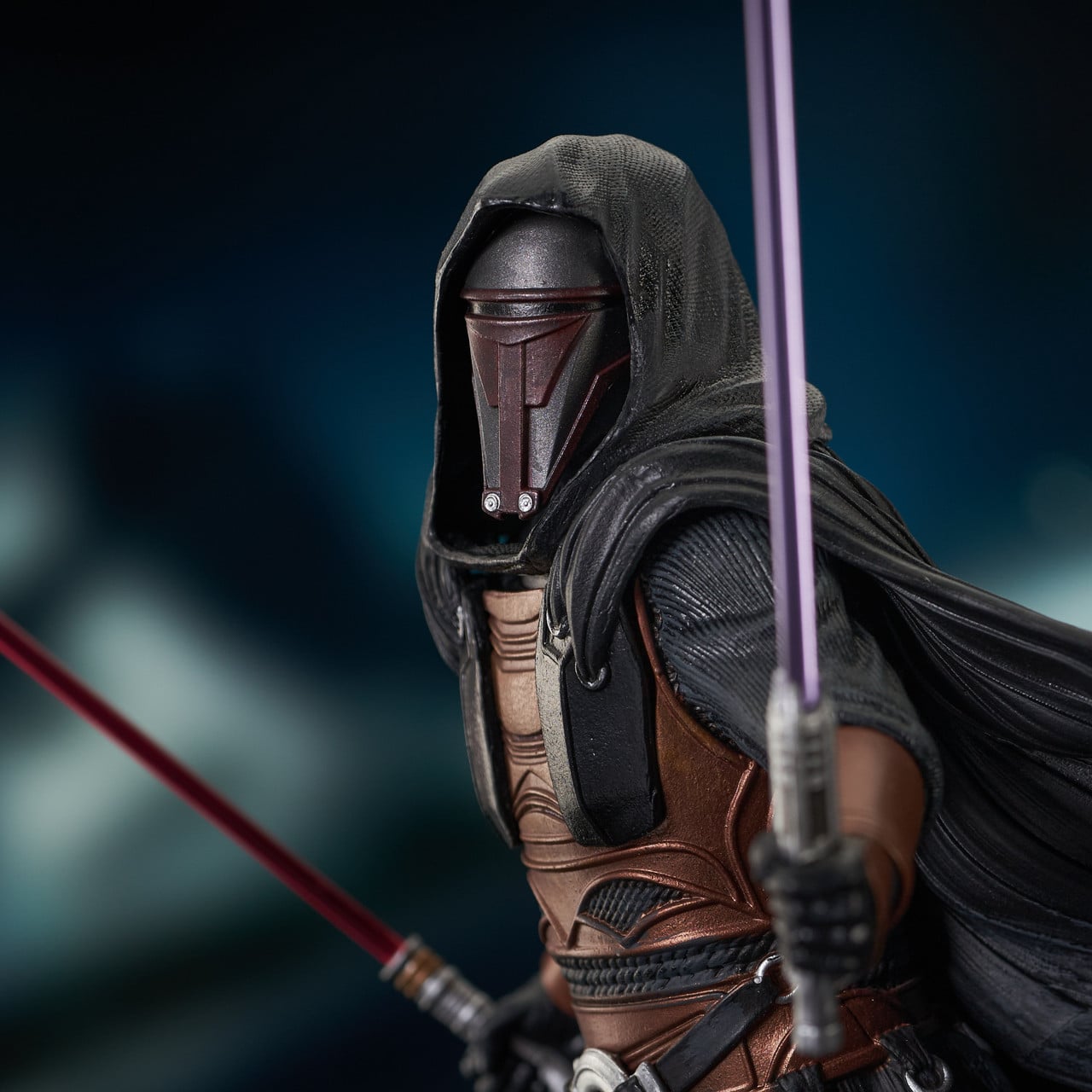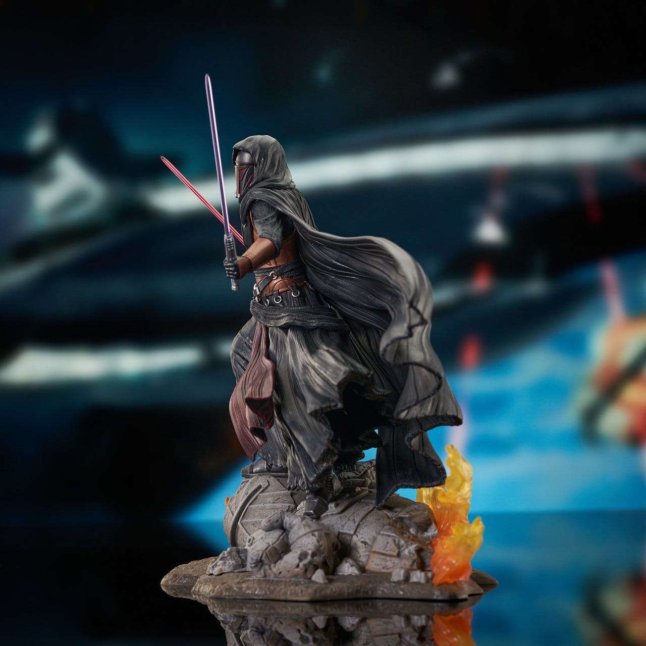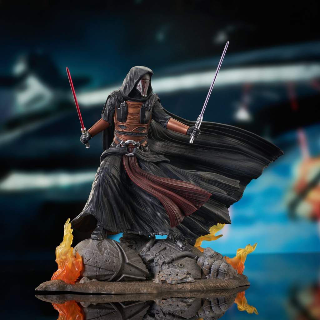 A Gentle Giant LTD release! As seen in Star Wars: Knights of the Old Republic, the Sith (or Jedi?) Darth Revan stands atop a flaming statue with two lightsabers and a flapping robe in this all-new Gallery Diorama by Gentle Giant LTD. Featuring detailed sculpting and paint applications, including translucent flames and lightsaber blades, it is made of high-quality PVC and comes packaged in a full-color window box.