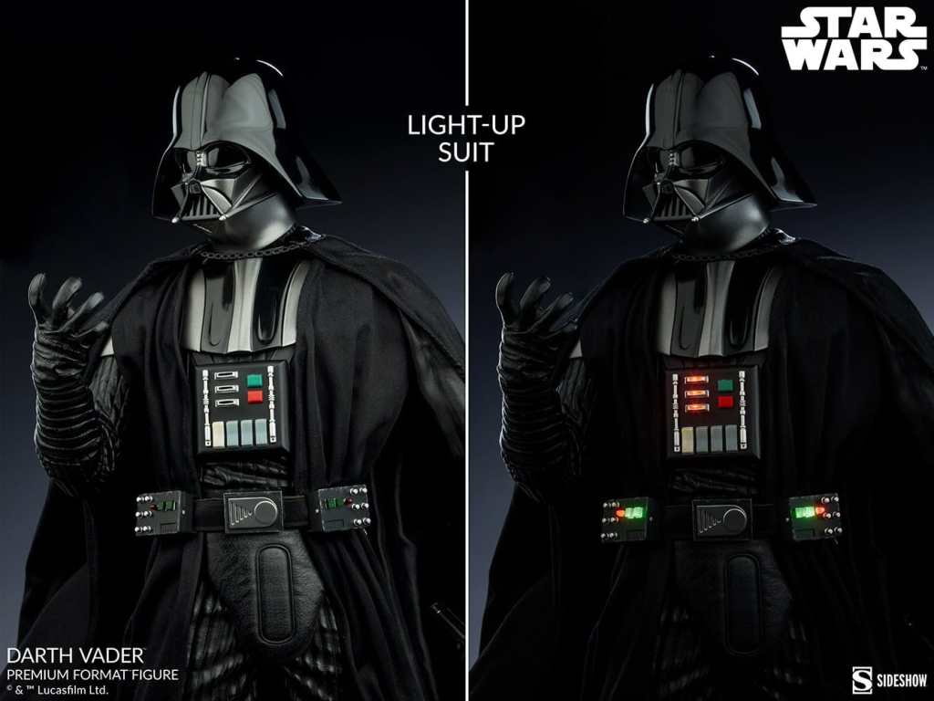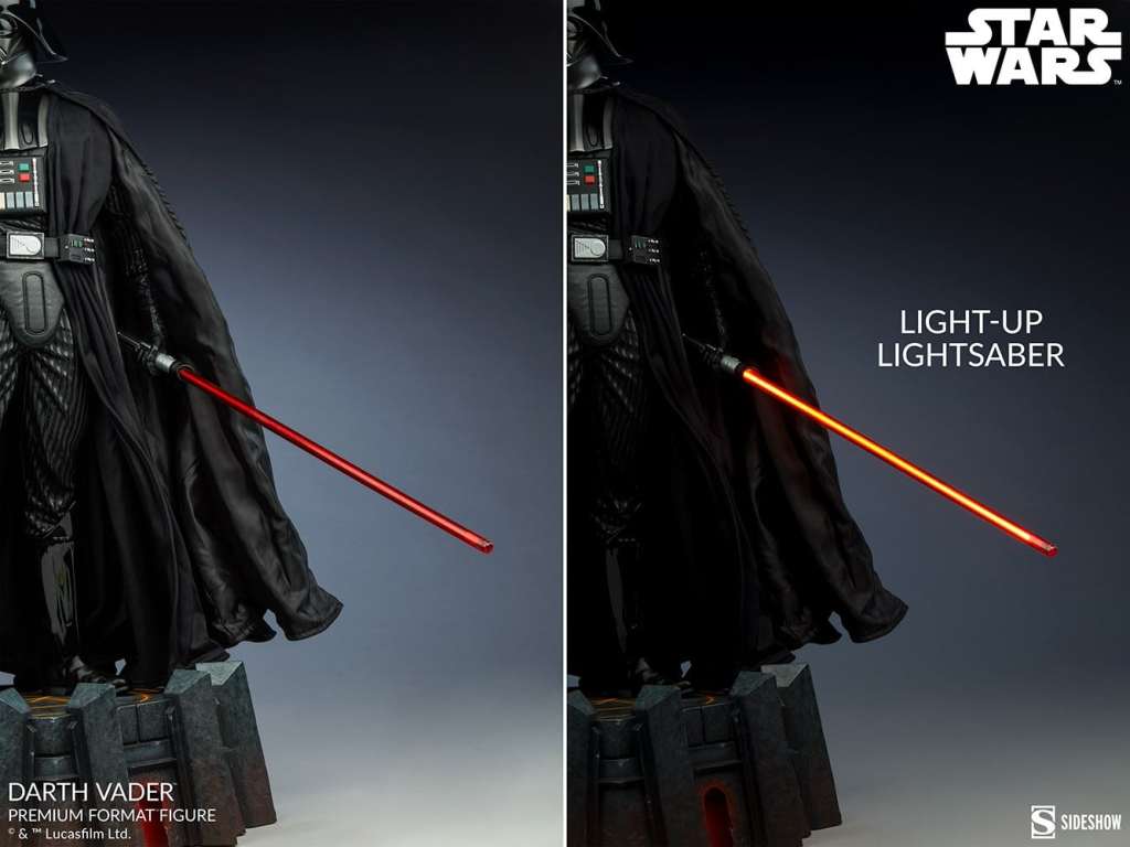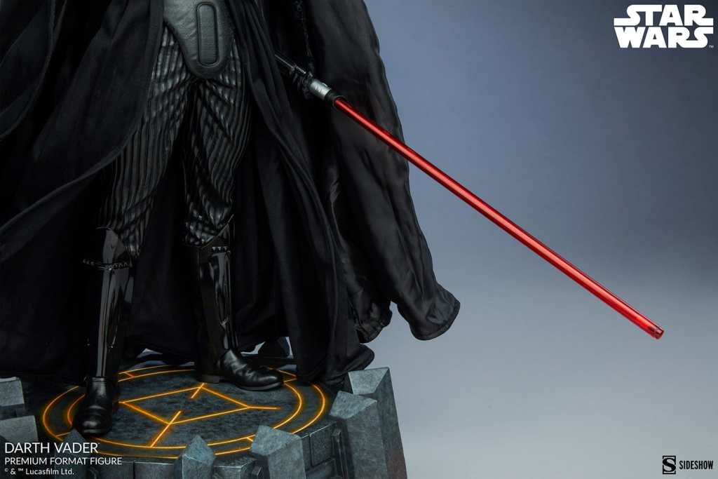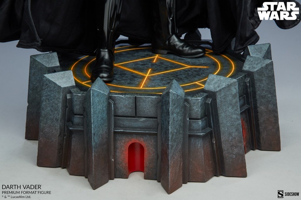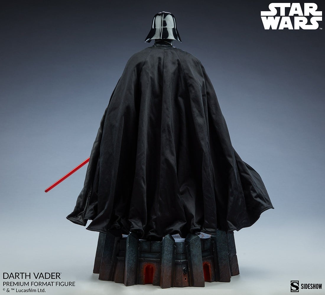 „Die Darth Vader Premium Format Figur ist 63 cm hoch und 35 cm breit, während der Sith Lord königlich und unbarmherzig auf einer Mustafar-Base steht. Mit steinartiger Struktur und feurigen roten und orangenen Farbapplikationen dient die dargestellte Festung als Vaders vulkanisches Hauptquartier in seinem Bestreben, die Rebellion zu vernichten. Mit seinem ikonischen roten Lichtschwert, das auch leuchtet, ist der dunkle Lord der Sith eine bedrohliche Figur, die es mit jedem Feind aufnimmt.