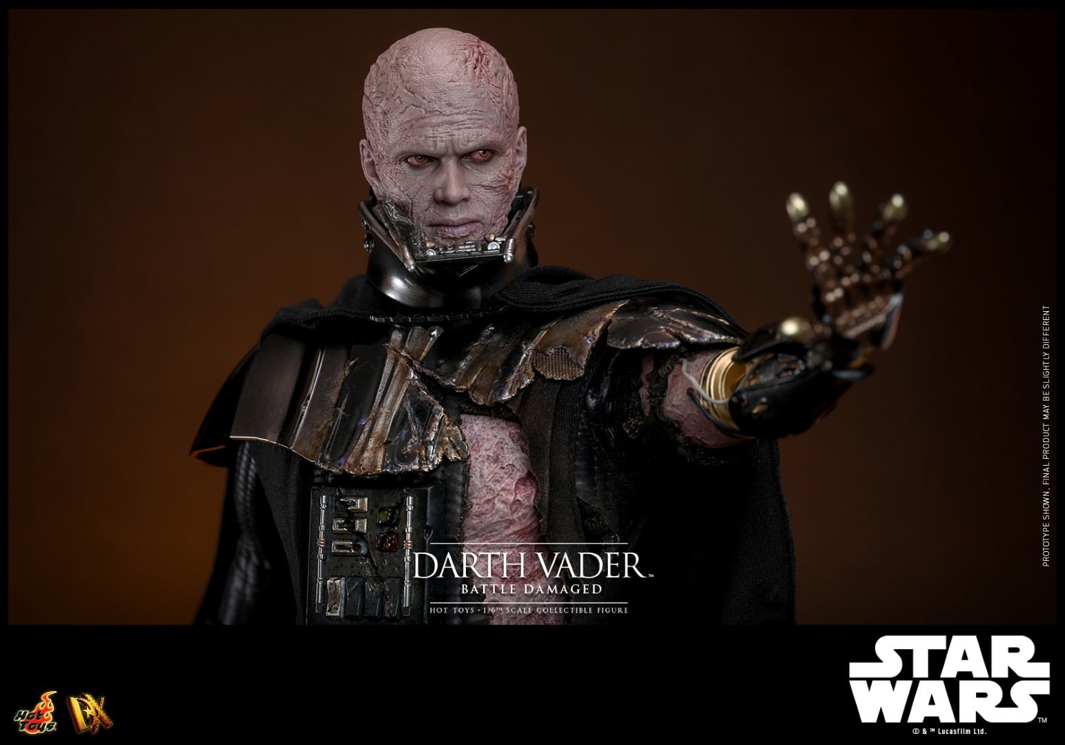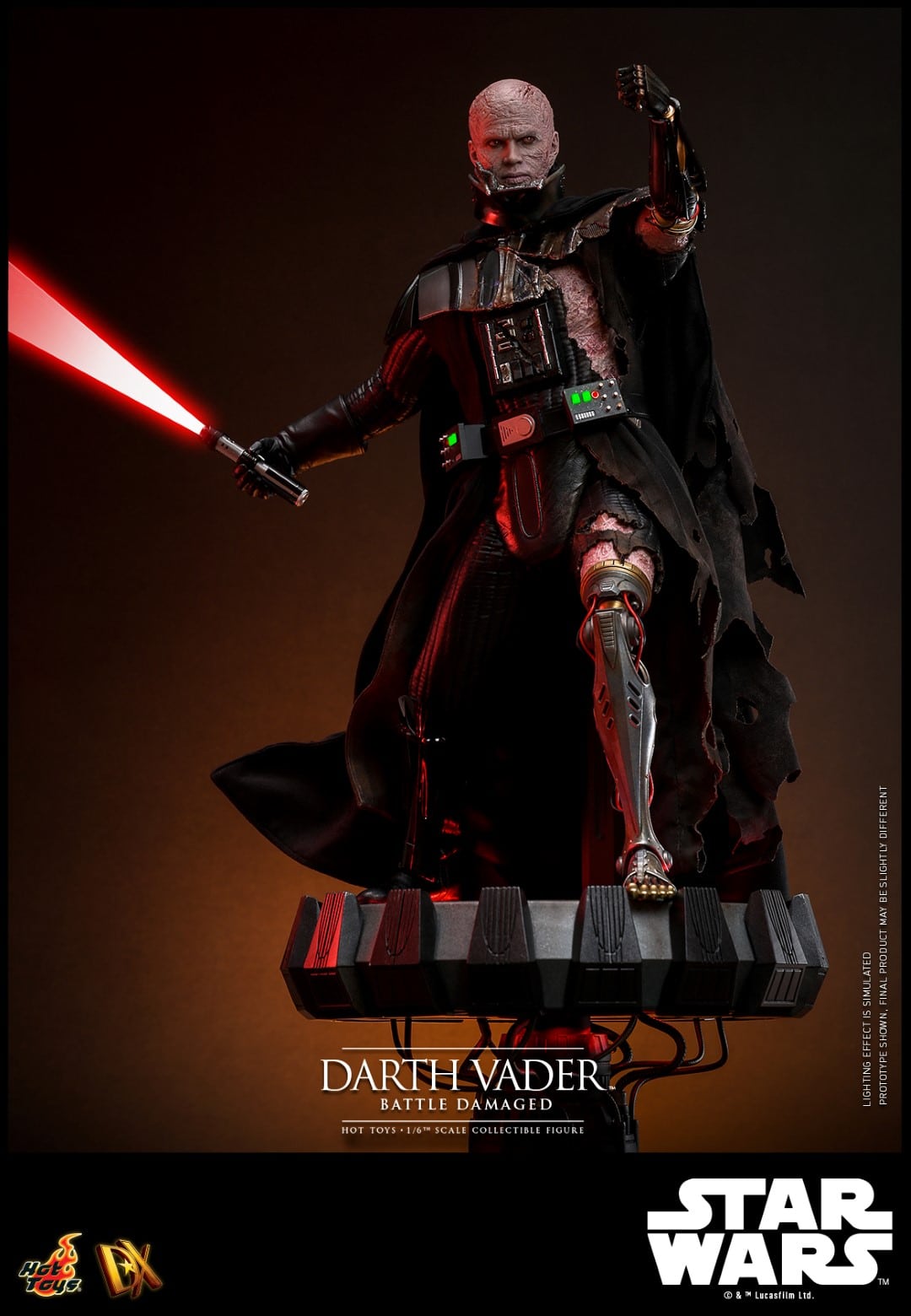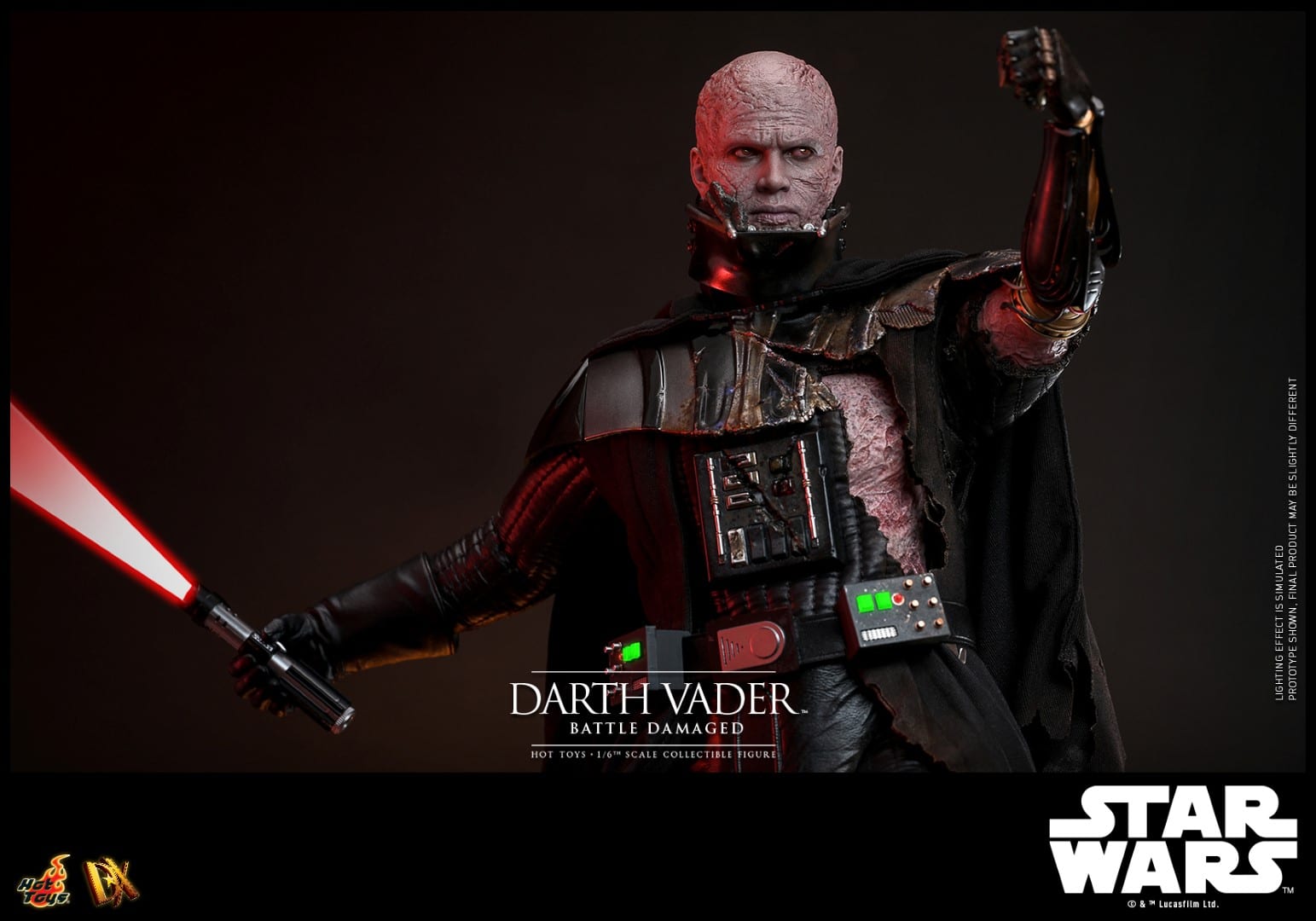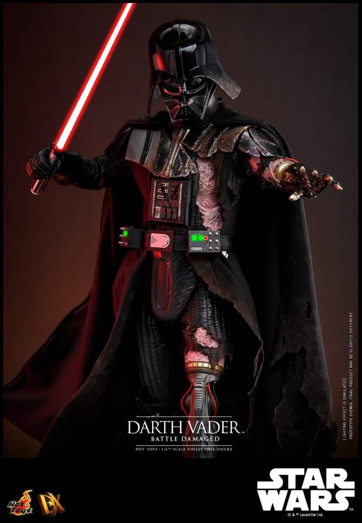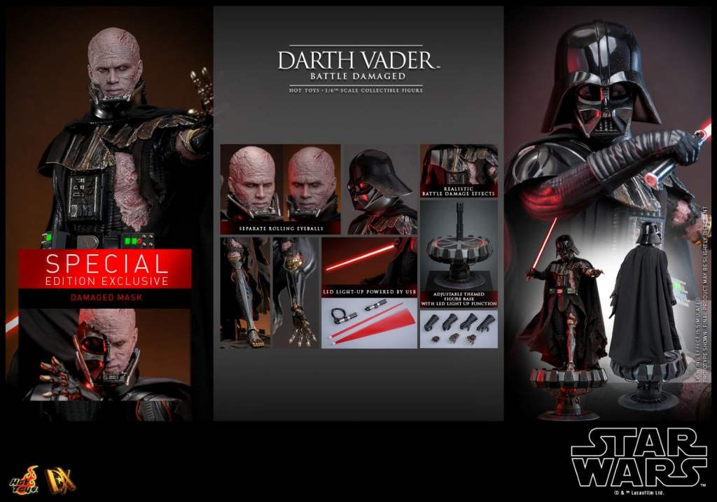 Vader erscheint in zwei bzw. vier verschiedenen Versionen für die DX Series, die sich diesmal jedoch nicht einfach nur durch irgendwelche Coins unterscheiden. Die sogenannte Collector Edition kommt mit separat beweglichen Augäpfeln, einem leicht zerschlissenen Helm, einem beleuchteten Lichtschwert und einer anpassbaren und ebenfalls beleuchteten Base. Außerdem ist er so Battle Damaged, dass er sogar einige künstliche Gliedmaßen und eine komplett zerschlissene Rüstung trägt.