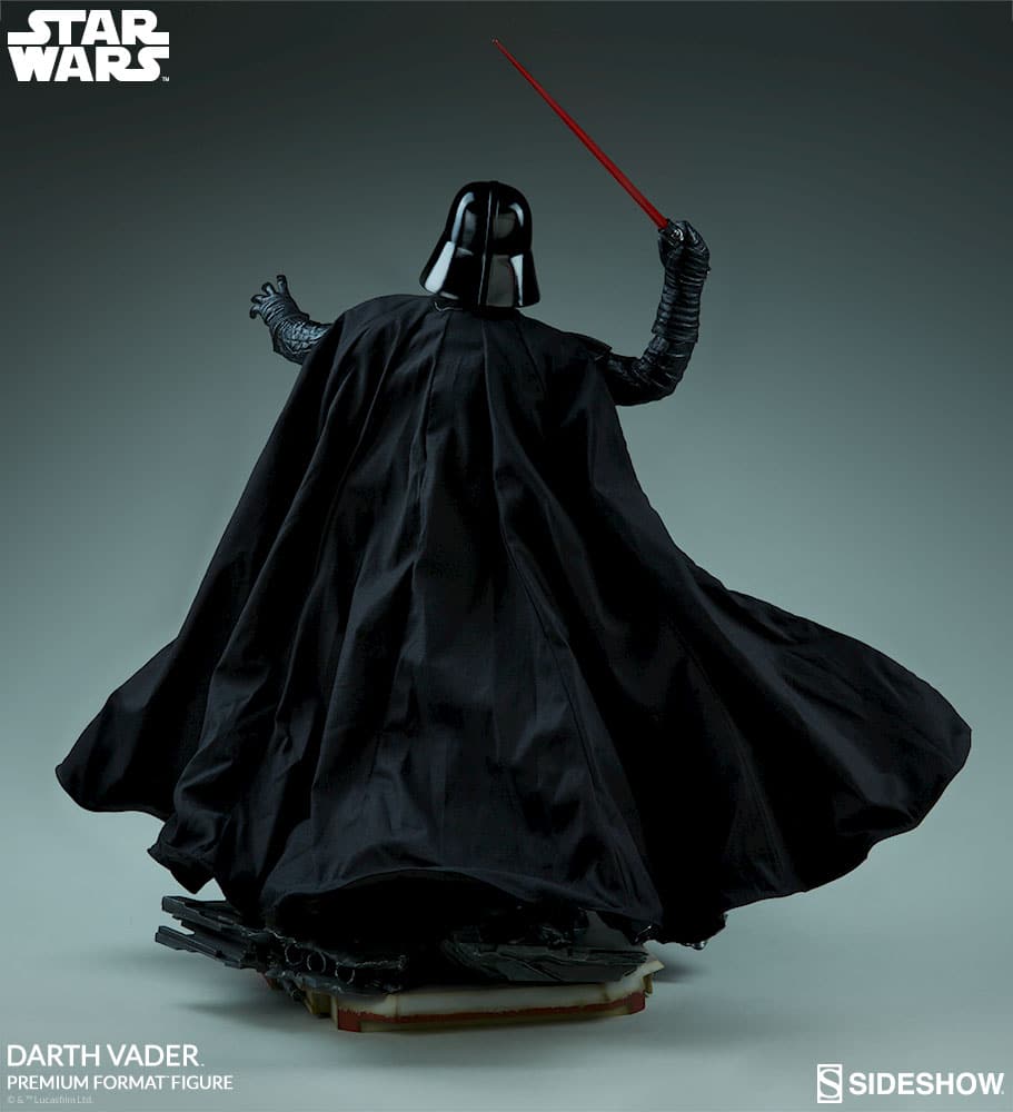 Darth Vader holds his red-bladed lightsaber above his head in a pose of dark rage as he decimates the Rebellion fleets. He is suited in his intimidating and iconic black costume, sculpted with realistic fabric-like textures on the arms and legs, as well as sculpted shoulder and chest armor. His helmet has clear lenses, and features the chilling stare of the Empire’s most infamous Sith. The polystone Darth Vader Premium Format™ Figure also features a tailored fabric tunic and billowing black cape that includes internal wiring for custom posing options.