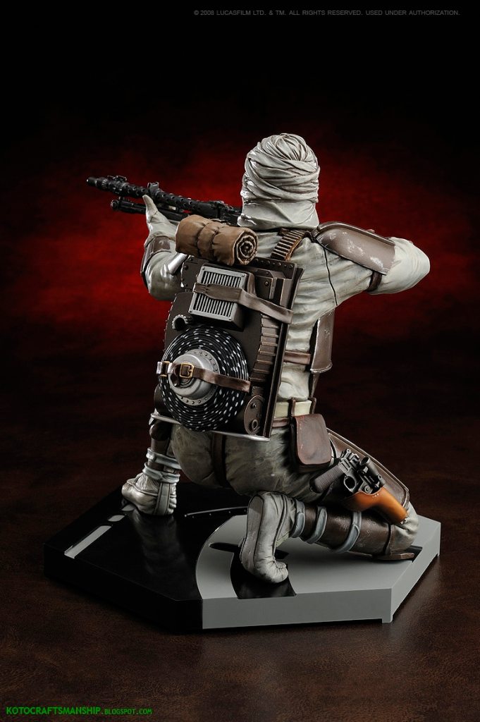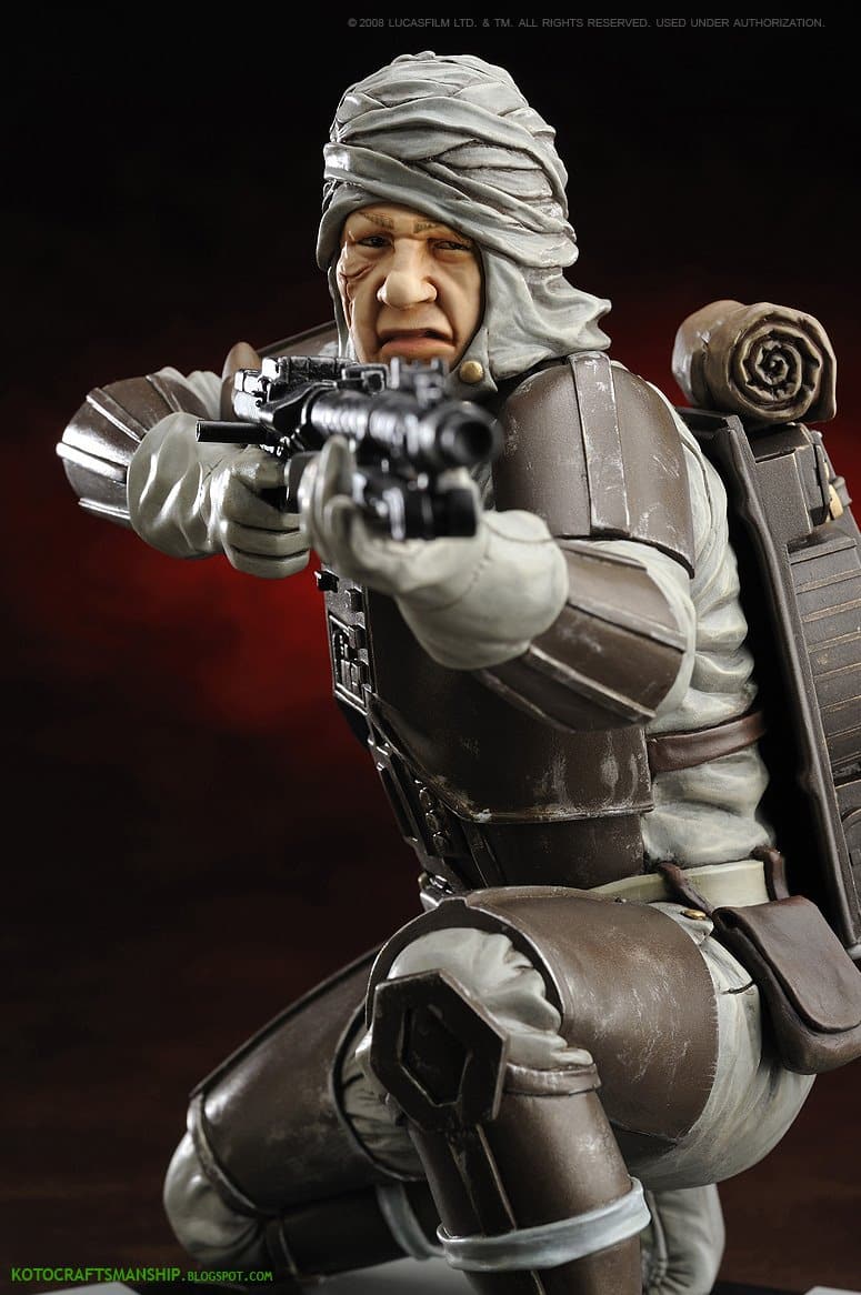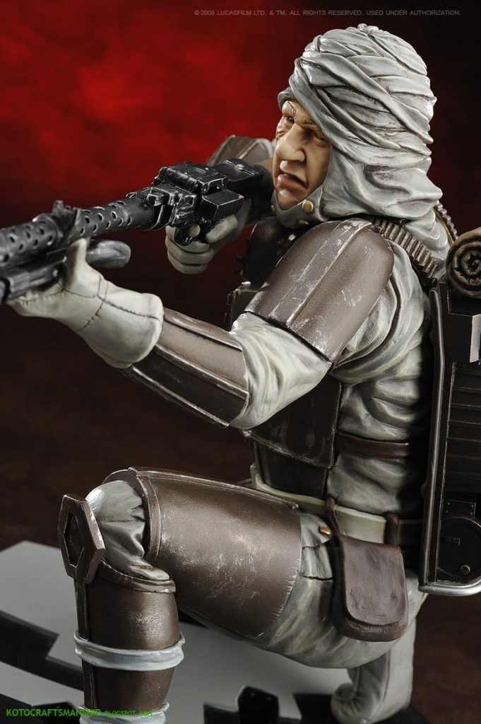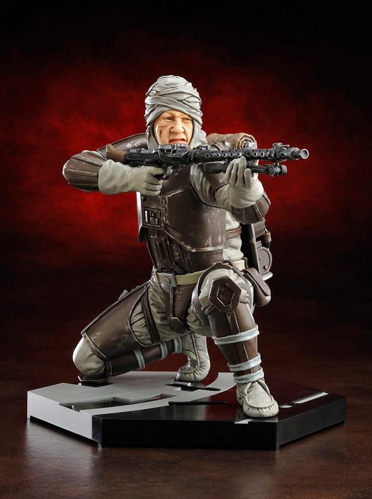Part of Kotobukiya’s fantastic „Bounty Hunter Series,“ here’s that shabbily-armored Corellian mercenary, Dengar! This fixed-pose, mostly pre-assembled and prepainted 7-inch-tall statue captures the swarthy rascal in a crouching sniper pose, with his Valken-38 blaster rifle (which happens to look a lot like a German WWII machine gun…) in firing position. Amazing detail! Base and sidearm blaster are included. This figure also includes the head and right arm parts #2 and #3 (seems like there are a total of three right arms!) to create a very cool Darth Vader statue. The rest of the Darth Vader statue parts are with the rest of the entries in the Bounty Hunter series, so collect all six: Bossk, IG-88, Zuckuss, 4-LOM, the legendary Boba Fett, and of course, our boy Dengar!
