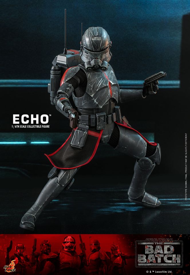 The highly-accurate collectible figure features skillfully crafted and finely detailed recreation of Echo’s armor and helmet, interchangeable head sculpt with great likeness, the character’s unique cybernetic parts including a variety of interchangeable mechanical right arms, a military backpack, blaster, and a display base!