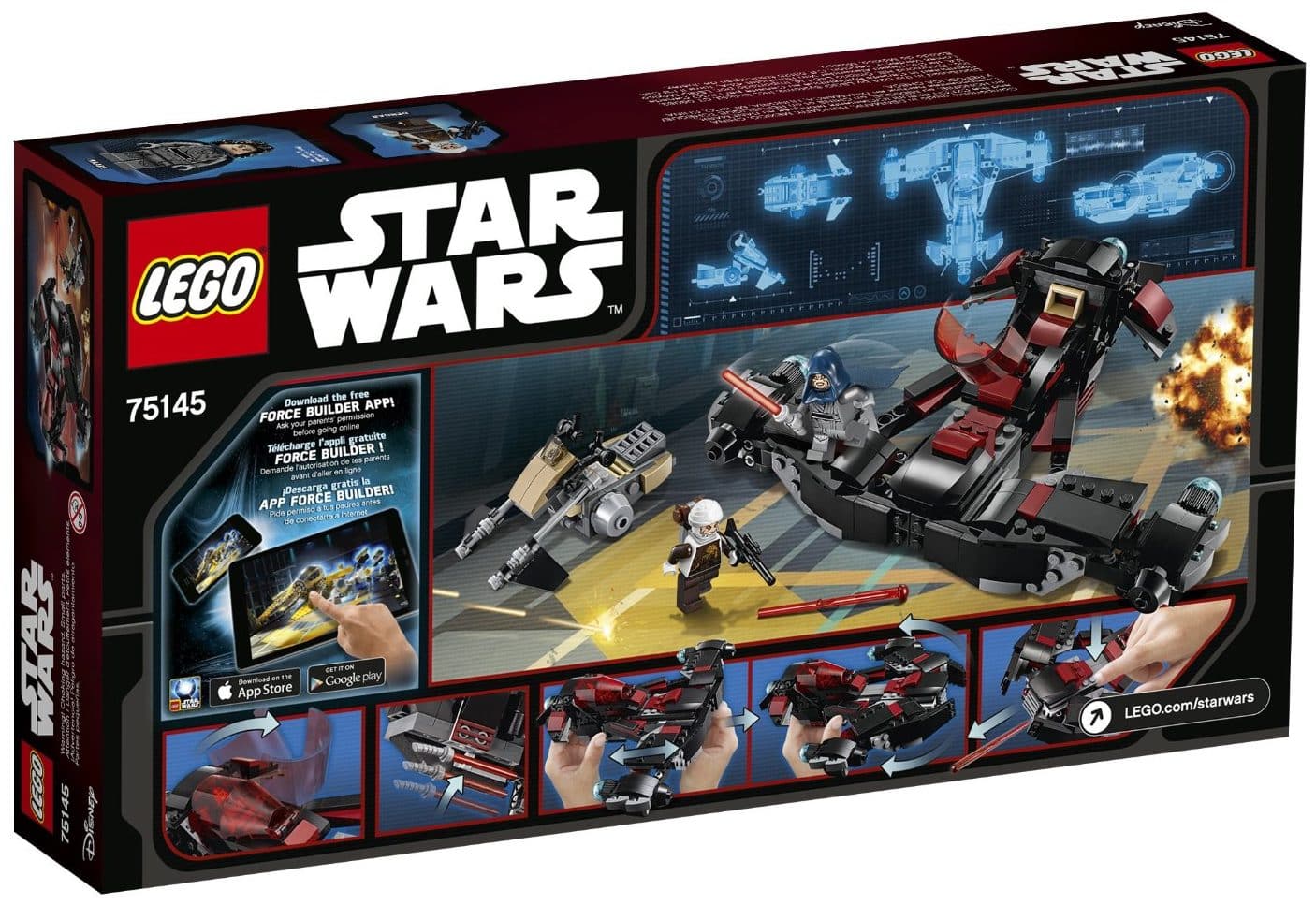 - Der Eclipse Fighter verfügt über ein aufklappbares Cockpit für eine Minifigur mit darunter befindlichem Staufach für ein Lichtschwert sowie über eine Verwandlungsfunktion, die die verborgenen federunterstützten Shooter zum Vorschein bringt.