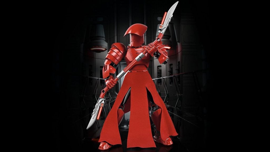 - Die baubare und äußerst bewegliche Figur des Elite Praetorian Guard verfügt über eine rote Rüstung mit Verzierungen auf der Brust und an den Armen, eine Textilschürze, einen Hebel, um die Arme schwingen zu lassen, sowie einen Beidhand-Klingenstab, der sich zerteilen lässt, um mit 2 kleineren Einhand-Klingen wirbeln zu können.
